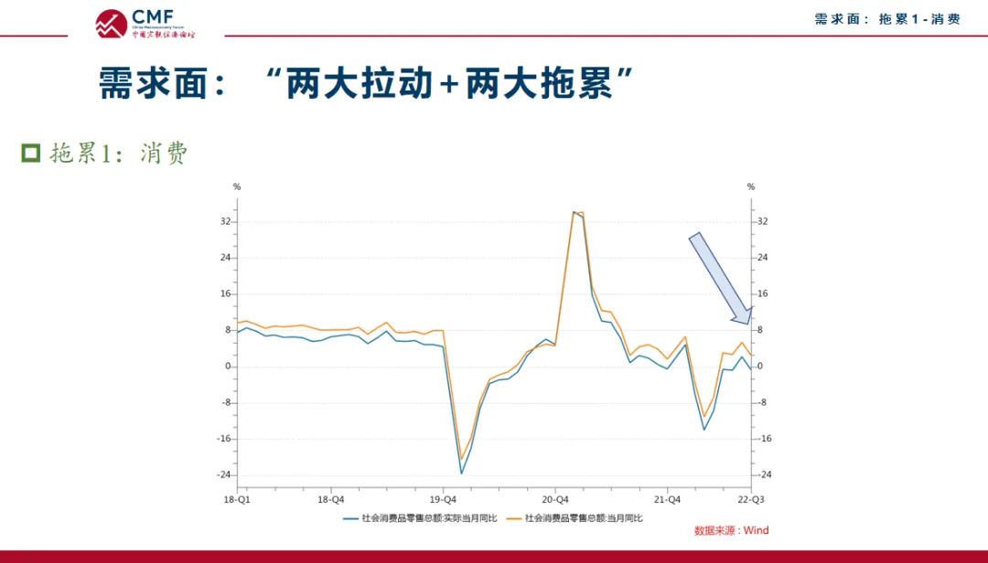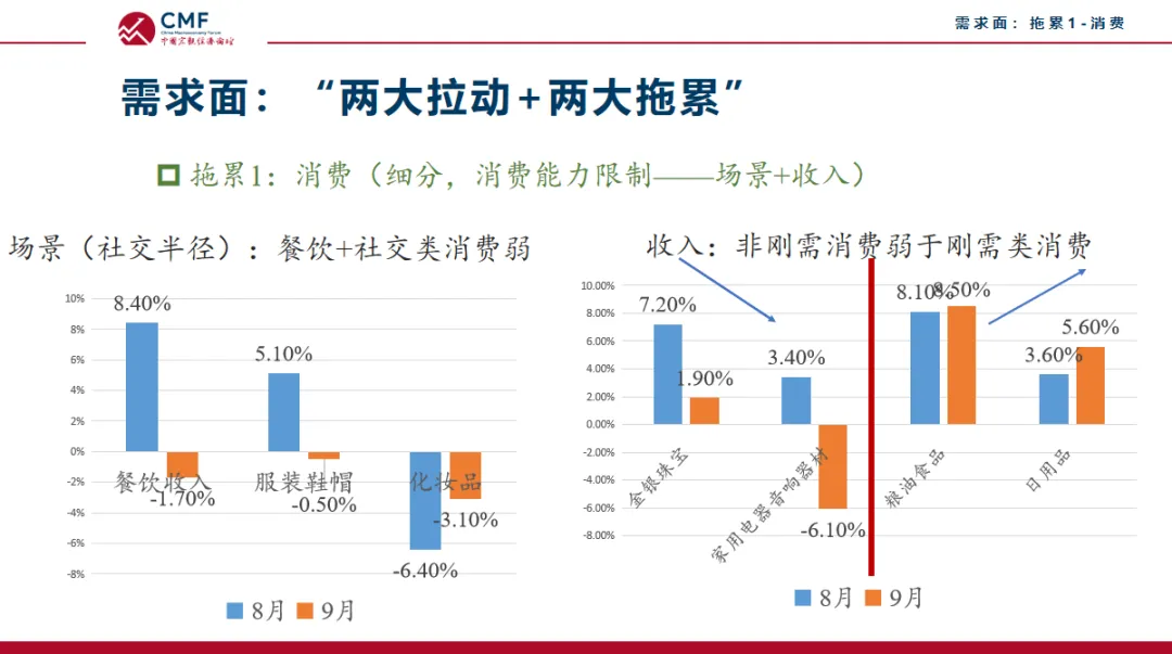 细分来看,消费也不是全都弱,弱的类别主要源于消费场景和居民收入的限制。消费场景受限主要是指由于疫情管控措施使得人们的社交半径大大缩小,这直接导致了餐饮和社交类的消费疲软。左边柱状图蓝色表示8月份的同比增速,橙色的是9月份的同比增速,餐饮收入在8月份还有8.4%的高增长,但是到9月份就变成了-1.7%,服装鞋帽8月份是5.3%的水平,到9月份变成了-0.5%,这都是源于消费场景的受限。除此之外,由于收入受限所导致的消费转弱集中反映在非刚需类消费上:下图以红色竖线为界,左边是非刚需类消费,主要代表金银珠宝和家用电器音响器材,这两类非刚需类消费9月较之于8月都有一个明显的下行;右边是偏刚需类的消费,粮油食品和日用品都是有所回升的。