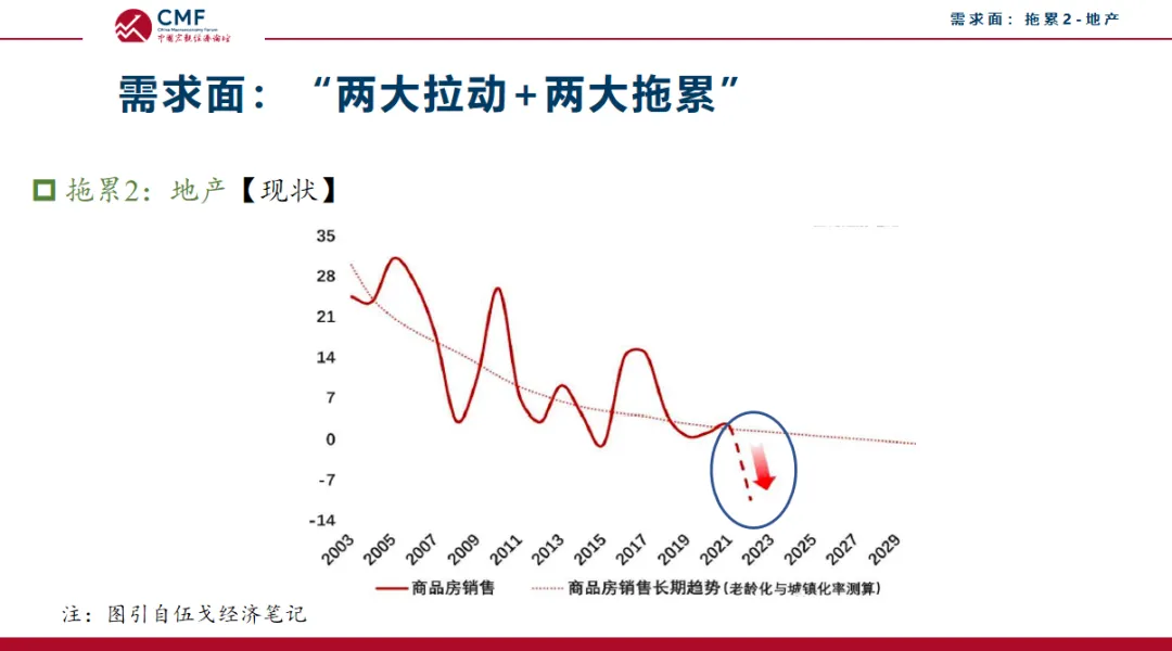 最后,拖累力量之二是地产。地产的下滑是由多方面原因导致的,这里面既与人口结构和城市化等基本面因素有关,也与政策的主动调整有关,还与地产行业在过去十余年间融资模式的变化有关。当讨论地产行业下滑时,首先要明确我们到底在关注哪一部分原因导致的下滑。这条虚线代表的是可以由基本面因素解释的长期趋势性下滑(引自:伍戈博士研究),从地产销售的实际情况看,现在已经大大偏离了长期趋势线。换言之,现在地产行业的下滑已经远远超出人口结构和城市化等基本面因素所能解释的部分了,相应超调部分很大程度上是源于供给端的融资问题。