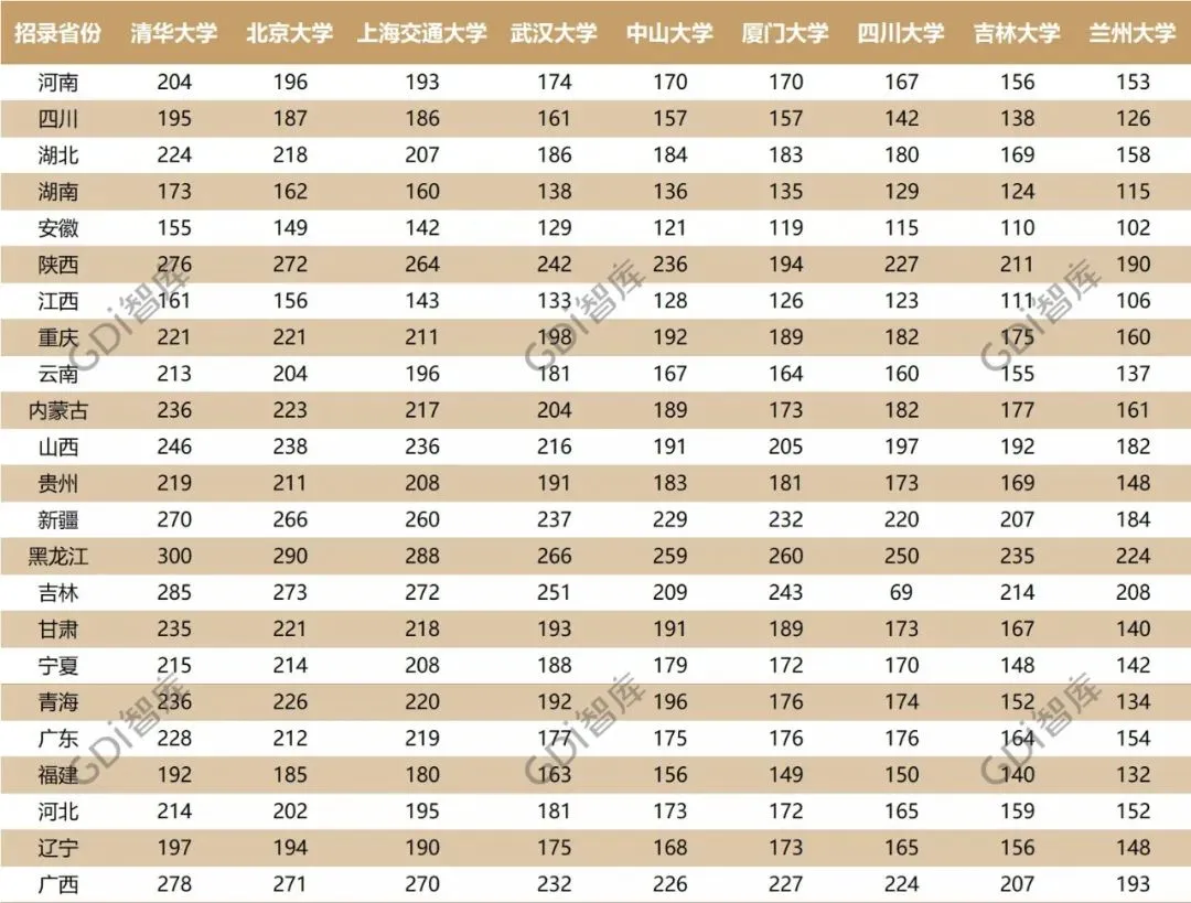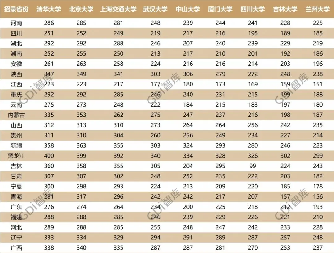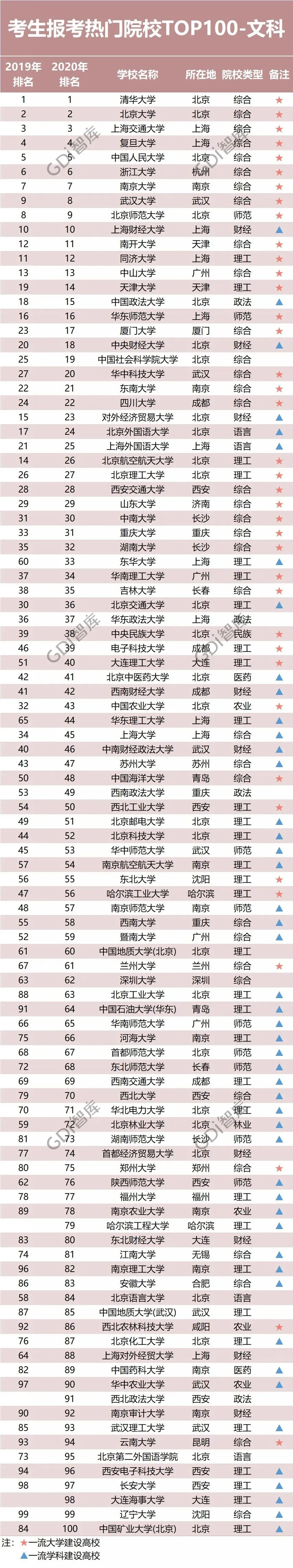 综合2019年和2020年录取线与省控线数据,百强大学文科榜中,清华大学连续两年位居榜首,北京大学位列其后。百强大学理科榜中,北京大学连续两年蝉联第一,清华大学位列第二。这一现象缘于两校文理科招生计划数存在差异,清华大学文科招生人数少,北京大学理科招生人数少,相应类别的考生报考难度也更大。