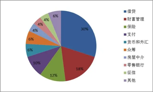 在TOP50金融科技公司中,借贷行业占比最高,为30%,有15家公司上榜;其次是财富管理行业,有9家公司上榜;保险行业排名第三,有6家公司入围;支付行业排名第四,有5家公司入围。