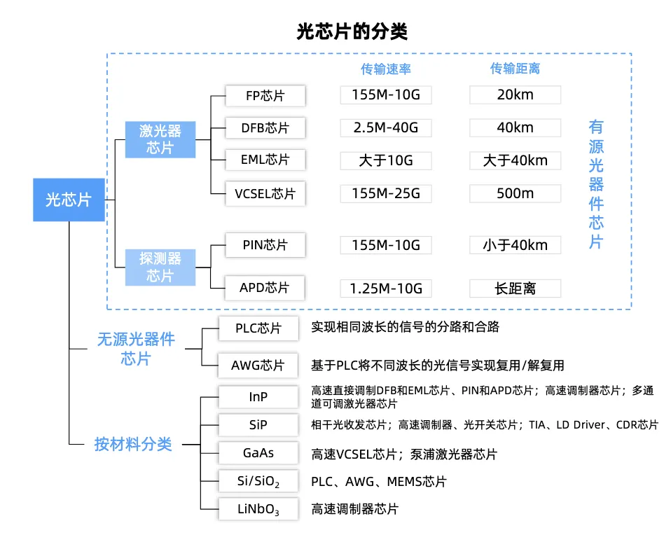 光芯片按功能可分为有源光芯片和无源光芯片两大类,二者分工明确、协同支撑光通信系统运行: