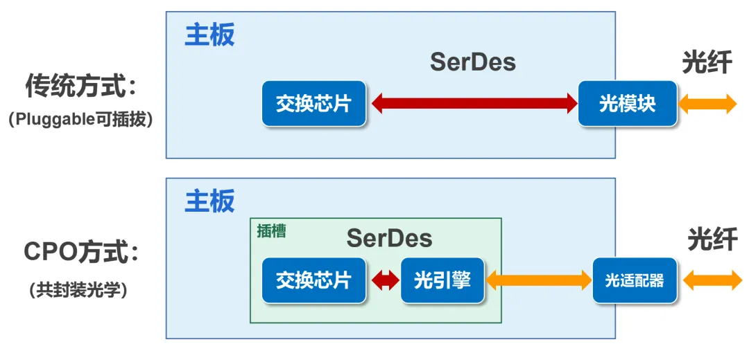光通信领域非常火的CPO(Co-packaged optics,共封装光学)技术,就是将网络交换芯片和光引擎(光模块)进行“共同封装”的技术。