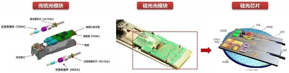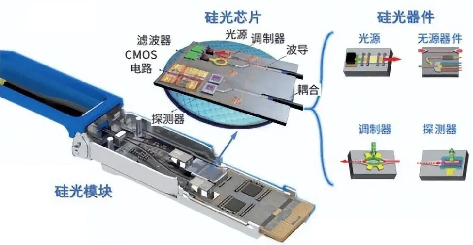 硅光光模块,采用CMOS制造工艺(就是制造电芯片的那些工艺,例如光刻、刻蚀、沉积等),直接在硅基(Si)材料上制造调制器、探测器以及无源光学器件,集成度明显高于传统光模块。