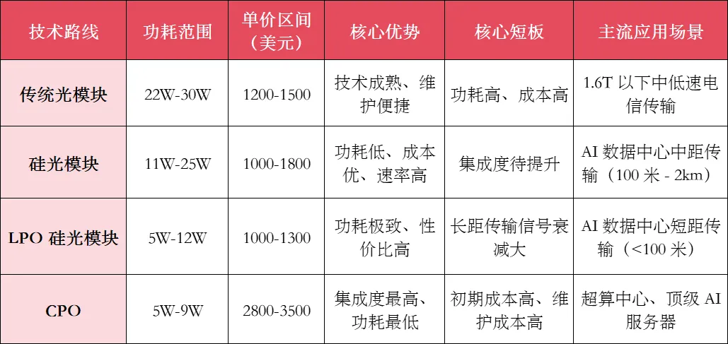 在 1.6T 超高速率场景下,传统光模块、硅光模块、LPO(线性直驱光模块)、CPO(共封装光学)四大技术路线呈现差异化竞争格局,硅光与 CPO 凭借性能优势成为未来主流方向:
