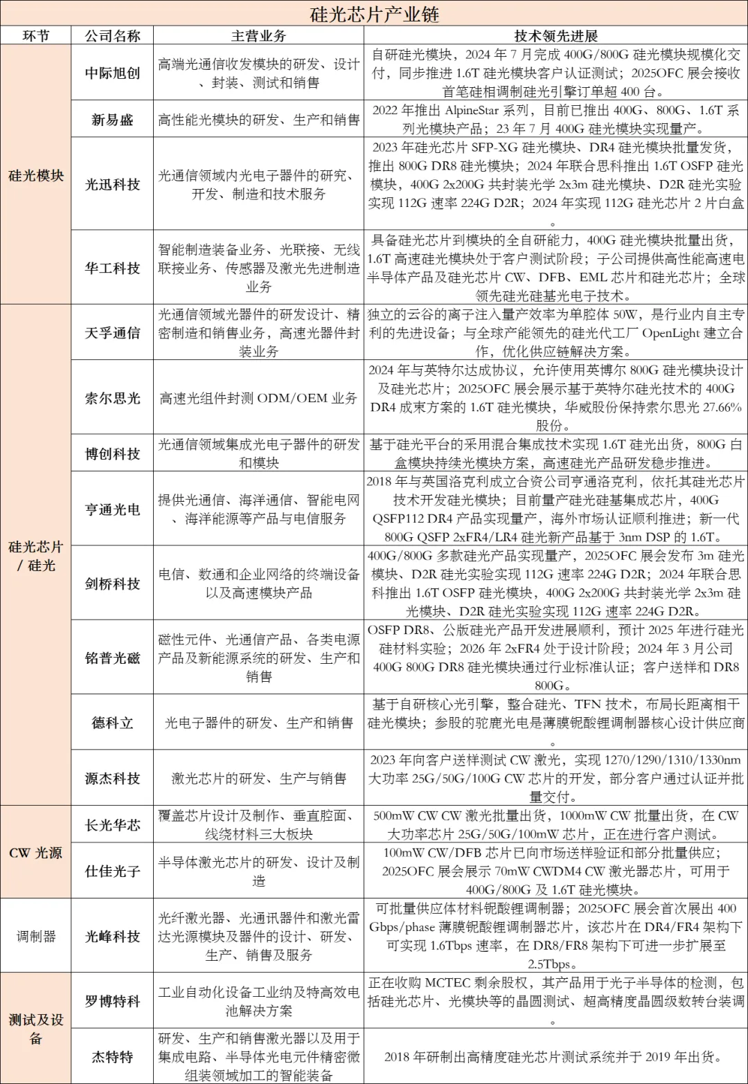 封装测试是保障芯片性能稳定的关键环节,核心流程包括贴片(SMT)、光器件集成、信号调试、可靠性测试等。天孚通信是全球CPO/硅光光引擎与封装技术绝对龙头,通过顶级封装技术将光芯片性能提升15%-50%,是英伟达、思科核心合作伙伴;光迅科技、中际旭创则具备垂直整合的封装测试能力,保障自身芯片与模块的性能匹配。