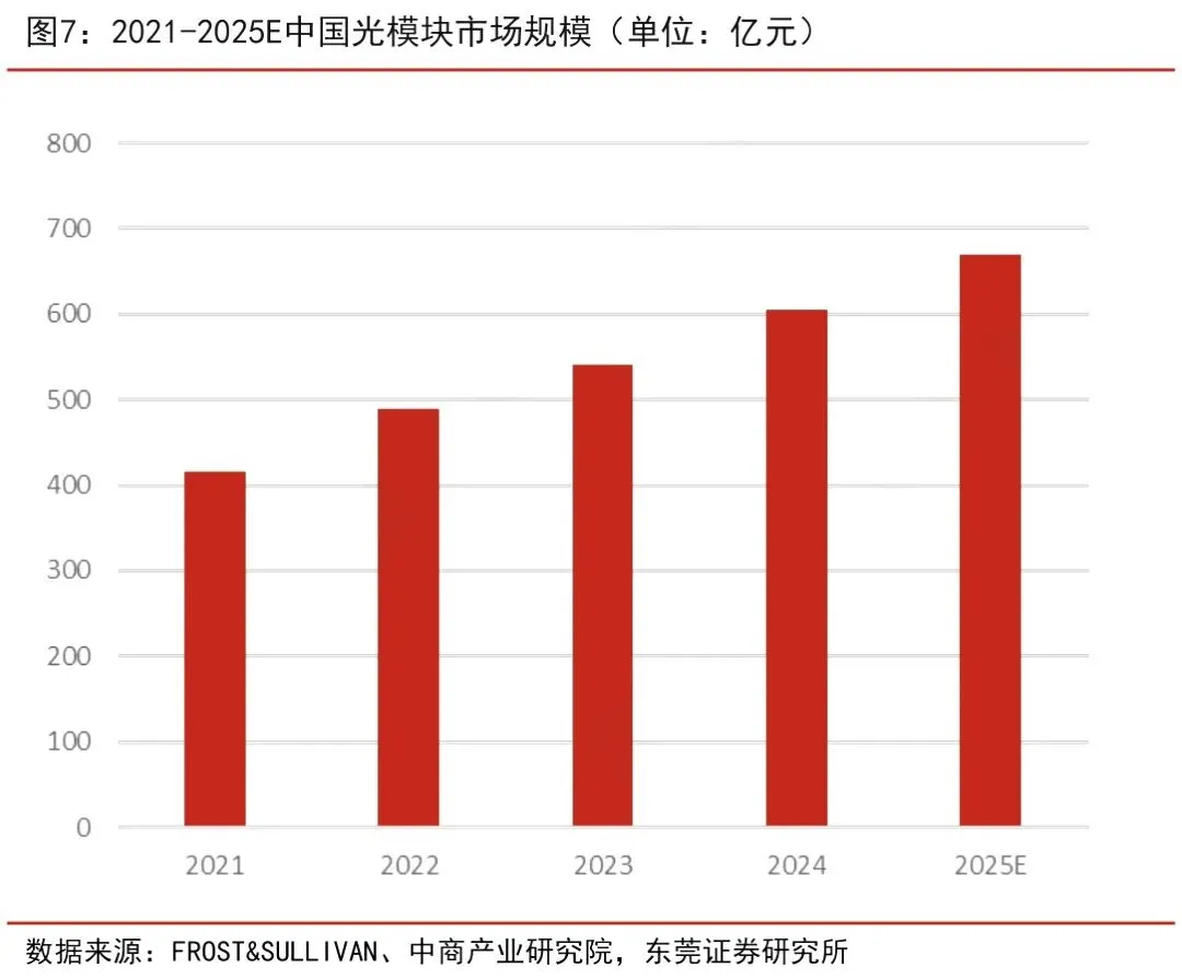 根据弗若斯特沙利文数据,2021-2025年,中国光模块市场规模呈现持续增长态势,2024年这一数据突破600亿元,预计2025年我国光模块市场规模有望突破650亿元。中国有望成为最大增量市场,2030 年占全球光通信芯片市场份额将提升至 60%。