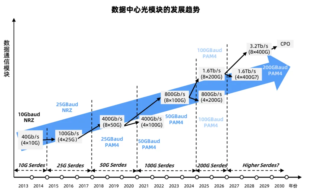 AI大模型训练/推理对算力的需求每3-6个月翻倍,传统电芯片性能增长已接近摩尔定律极限,光芯片成为突破算力瓶颈的核心支撑。该场景需求高带宽、低延迟光模块,主流速率从400G向800G/1.6T升级,CPO技术逐步替代传统可插拔模块。