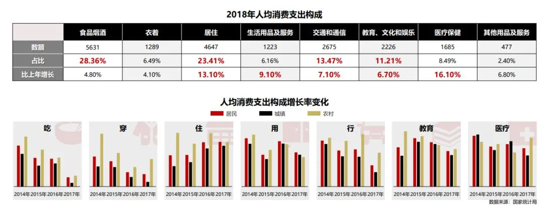从消费发展的角度看,随着人们可支配收入的不断增加,以及对美好生活的向往,消费的总规模不断扩大。根据国家统计局的数据,2018年我国社会消费零售总额为38万亿元,同期增长9.0%,最终消费支出对GDP增长的贡献率达到了76.2%。不过,要说明的是,在不同的发展阶段消费呈现的特征是不一样的。最近,铅笔道研究院发布了《2019年新消费新风向》,针对不同阶段消费呈现的不同特征,对新消费发展的趋势和未来进行了深度的探讨。在这份报告中,将消费根据不同的时间截点,大致划分成三个阶段。以2008年金融危机为标志,让我们认识到投资对经济拉动的作用越来越不明显。在此之后,消费被视为拉动经济的新引擎。2011年,消费对GDP的贡献首次超过了投资;2012年,最终消费对GDP的贡献率首次超过了50%。在消费启动阶段,主要以生存型消费为导向,生产和服务活动主要围绕吃、穿、用等生活领域。最有代表性的,除了方便面之外,还有就是以淘宝为代表的电子商务,在这一时期都取得了蓬勃发展。第二阶段:2012年到2018年,消费的快速发展阶段。根据预测,今年消费对GDP的贡献率有望超过80%。也就是说,在过去七年时间里,我国消费对GDP的贡献率就足足提高了30个百分点。在这个阶段下,汽车消费、信息消费、个人信贷消费成为必需品,人们对生活的要求也从“生存型”过渡到“享受型”。于是,企业试图通过新品牌、新渠道、新营销构建起与消费者的新联系。比如,喜茶、奈雪成为新茶饮领域的标志性品牌;比如,以名创优品、优衣库为代表的快时尚品牌迅速崛起;再比如,以天猫、网易严选为代表的线上平台完成蜕变。所谓的“新消费”,其实主要是为了区别于传统工业时代的消费。在这个阶段下,消费者获取某一商品不再是单纯为了产品本身,更多是从满足心理需要的角度出发。不仅如此,消费者还越来越重视个性化、深度化的产品和服务,讲究消费行为的唯一性和标新立异。相比于“物美价廉”而言,“高质高价”的商品更加容易受到消费者的亲睐。换言之,单纯试图通过“低价”或者“高性价比”打动消费者,显得越来越失效。在铅笔道研究院看来,新消费时代下技术和生产环节不再是独立的存在,上下游的合作也不再是简单的合作链关系。准确的说,从原材料采购、产品设计、研发、制造、营销、售后等诸多环节,构成一个协同制造的闭环。同时,基于智能制造的运用,通过物联网传感器采集大量数据后,再用云技术数据的处理和分析,最后制定出正确的决策。比如,新零售概念下的智慧门店;比如,基于信息分发机制的抖音短视频;再比如,大数据支配下的菜鸟网络!前面提到,在新消费环境下,个性化的产品和服务越来越受亲睐,结果导致消费者越来越分散,大批量标准化的生产方式显得越来越过时。而背后反映出来的问题其实是,人们对生活品质的要求越来越高。食品烟酒的消费占比尽管仍高居第一,但是其增长率仅为4.8%。与此形成鲜明对比的是,居住和医疗保健的占比同比增长为13.1%和16.1%。实际上,无论是农村居民还是城镇居民,在吃、穿、行上的开销占比都呈现下降的趋势,而在住、教育、医疗上的投入则越来越高。也就不难理解,腾讯为何在2019年世界人工智能大会上宣布,未来十年,智慧医疗将是腾讯的发展重点!