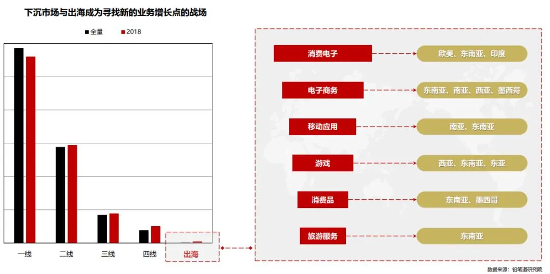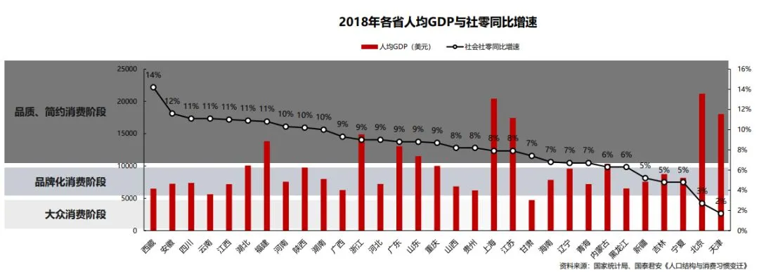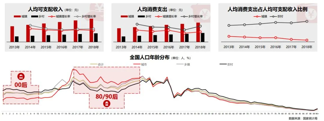 新消费发展趋势的展望 在《2019年新消费新风向》报告中,针对新消费的发展趋势,提出了六点展望。2013年以来,我国可支配收入的增速超过了GDP的增速,这就说明,居民的消费能力得到正向的拉动作用,并且消费潜力越来越大。在大众消费阶段,消费者对产品的要求更多是“耐用”。但随着品牌意识和消费者意识的觉醒,消费者的口味和偏爱变得越来越难以琢磨,或者说变得越来越挑剔。3.不同年龄段都存在特定的市场机会,尤其中老年市场。众所周知,时间越往后推移,我国老年人口的占比也就越高。目前来看,80后和90后在城市的比例要高出乡镇和农村,不过00后及新生代主要集中在乡镇和农村。这就反映出了一个问题,从未来的趋势来看,城市老年人会越来越多,00后及新生代留守在中小城市和农村,是下一个值得关注的市场领域。往小的说像职业司机、游戏玩家、差旅用户,往大的说像女性、儿童、病患商户等等!就特定需求来说,比如街舞爱好者,比如养宠物人群,比如有借款、分期用户……尽管市场容量不大,但由于竞争不够激烈且仍在高速增长,也值得特别关注。5.寻求建立商业联盟,扩展品牌的调性、增加用户粘性。在整个汽车利益链条下,包括汽车贷款和汽车保险,也包括汽车美容、汽车保养、汽车维修、汽车配件等等。除此之外,车载系统和汽车租赁也是重要的组成部分。当然,还有线上和线下的二手汽车交易平台。由此拓展,不仅商家需要寻找联盟,包括品牌跨界营销和代言人联盟,都成为了新时代下的新玩法。电子商务、消费电子、移动应用游戏、消费品、旅游服务,几乎每一个领域在东南亚都有极其广阔的增长空间。究其原因,东南亚所占的领土尽管不是很大,但是众多的人口就决定了未来的消费趋势。而中国与东南亚的地理位置非常的接近,可谓是得天独厚。
