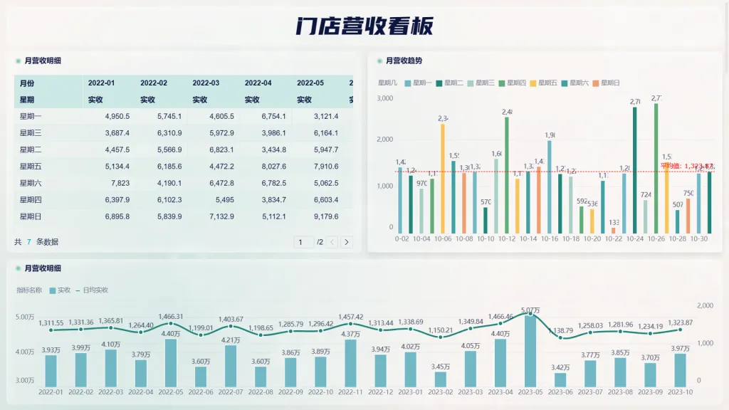 门店营收看板从周和月两个时间维度对门店营收进行分析,全面地揭示门店的经营状况,能够助力店家及时发现并解决经营过程中出现的问题。