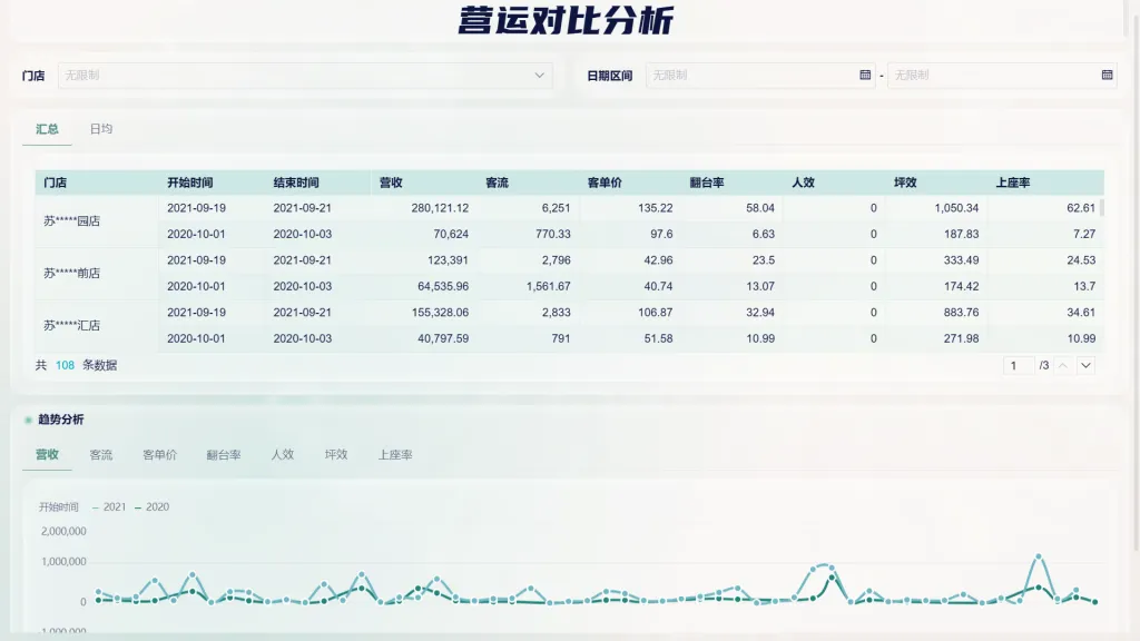 在营运对比分析看板中,以明细表的方式从汇总数据及日均数据两方面展现了各大门店在某一时间中的七类指标数据,便于管理者查看具体到某一天某个门店的具体指标表现情况;通过折线图分别表现了各个门店的七类指标表现情况,以及和去年同比的表现情况。