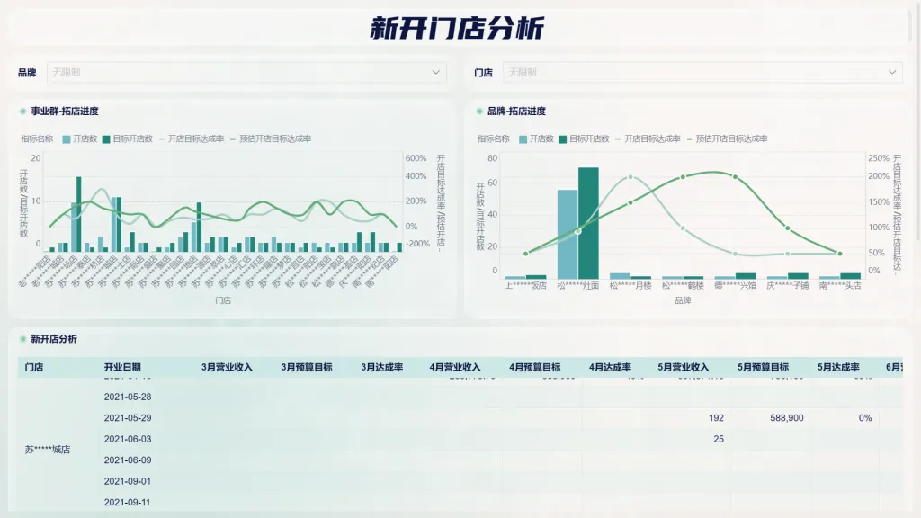 通过新开门店分析对不同门店每个月的营业收入、预算目标以及达成率进行了统计;
