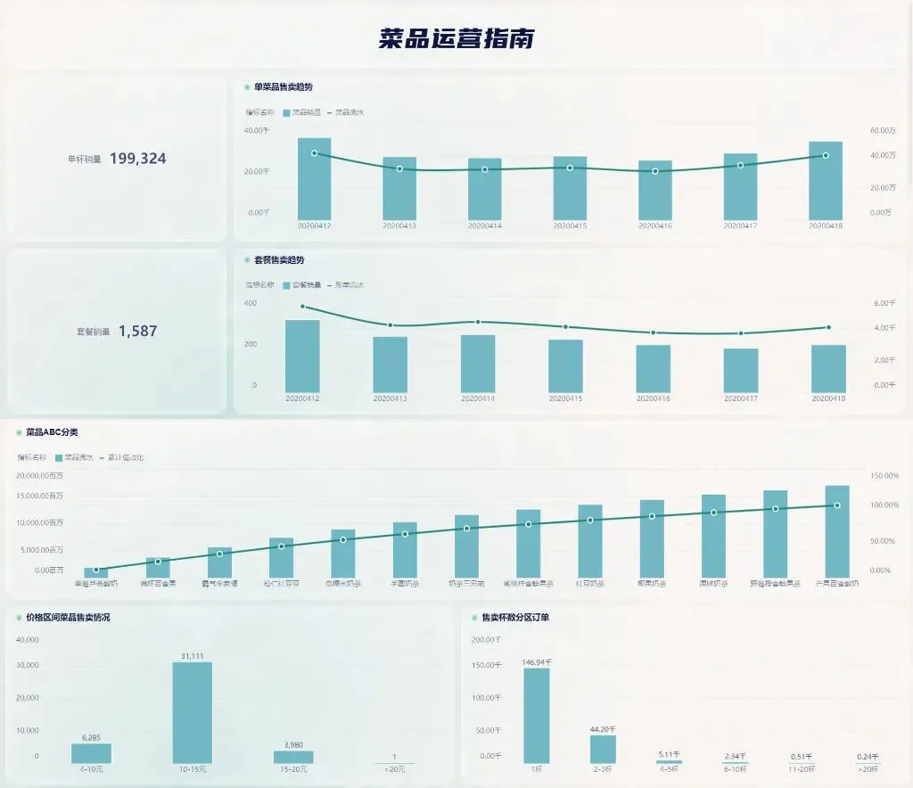 餐饮行业的运营除了一些基础的运营数据分析,还包含了一些特殊的、独有的数据分析,例如菜品分析、客户人群分析、点评分析、各类消费券分析等,我们同样提供了各类看板供参考!