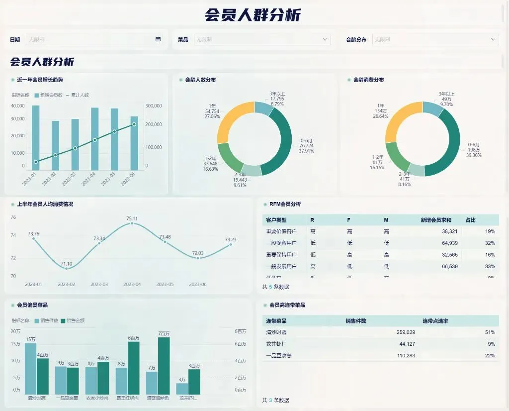 会员分析又称私域分析,私域的目的是为了从一个更好服务客户的维度提高营业额。既要维护存量客户,也要吸引新的客户加入成为增量会员。对会员人群进行分析,可以帮助我们更好地了解现有存量会员的增长趋势、年龄、消费水平等数据,也可以从现有会员偏爱的菜品与活动作为出发点吸引新的会员加入。
