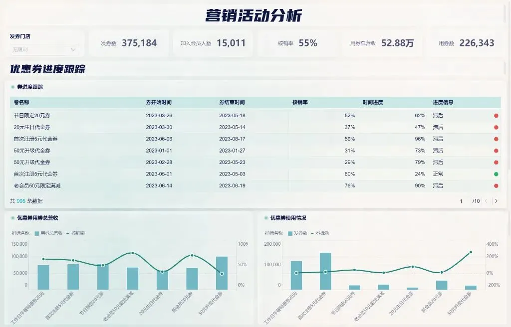 营销活动分析看板可以实时追踪和分析每张优惠券的使用情况,了解用户对优惠券的使用习惯和偏好;还可以准确评估优惠券营销活动的效果,了解优惠券对销售额的贡献程度,从而优化营销策略,从而基于对用户行为的深入理解,企业可以制定更精准、更个性化的定向营销策略。