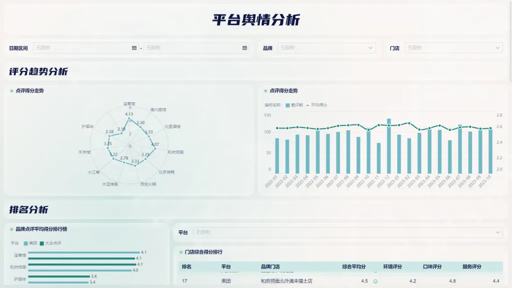 本模版首先从评分趋势出发,分析不同门店以及不同时间的店铺得分趋势。然后进行排名分析,对品牌的各平台店铺平均分进行排名,对门店的综合得分进行排名。周末与工作日的就餐体验也有差异,因此本看板从周末与工作日差评数与原因展开分析,帮助门店更好调整店内服务。最后汇总进行差评分析,展现不同门店的差评情况,便于管理者及时对症下药加强产品质量、提升服务水平、优化营销策略。