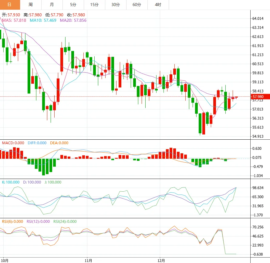 从技术面来看,美原油( WTI )日线图形仍处于偏弱震荡格局。价格在前期反弹后受制于 59 美元整数关口,多次上行未能有效突破,显示上方抛压较重。目前油价运行在 5 日与 10 日均线下方,短期均线拐头向下,对价格形成压制;20 日均线位于 60 美元附近,构成关键反弹阻力。动能指标方面,RSI 徘徊在 45 — 50 区间,未能重返强势区域,表明多头动能不足但空头亦未形成单边趋势;MACD 指标仍处于零轴下方,绿柱虽有收敛但尚未形成金叉,暗示反弹持续性有限。整体来看,在基本面供应过剩预期未明显改善之前,WTI 日线更倾向于在 57 — 60 美元区间内反复震荡,下方需重点关注 57 美元一线支撑,若失守,油价可能重新测试前低区域。