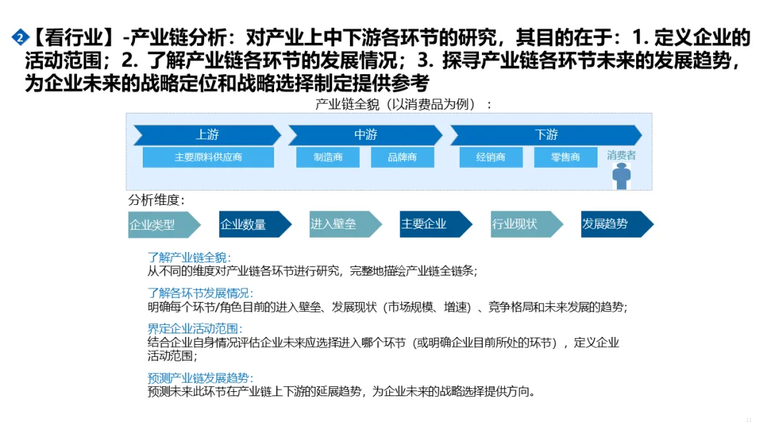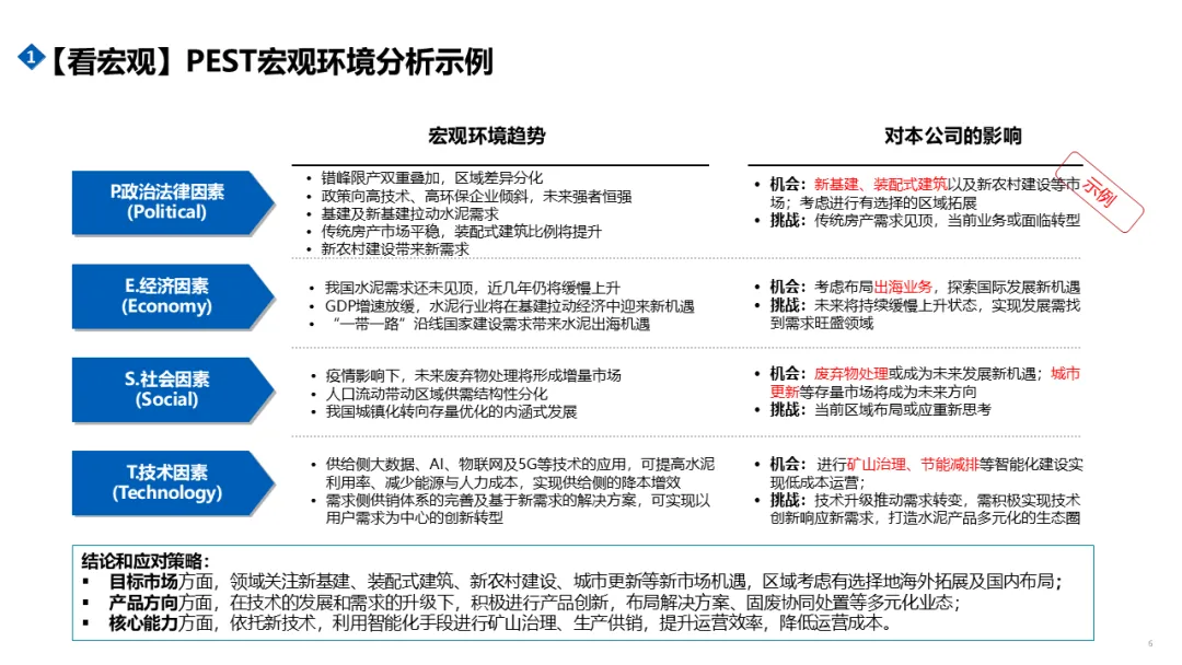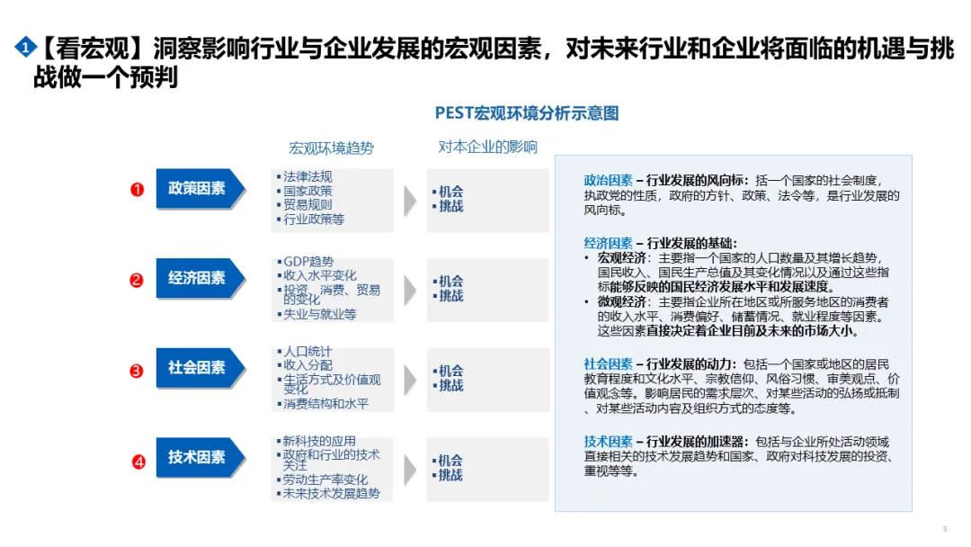 看宏观:通过PEST等工具分析政治、经济、社会、技术等宏观趋势,预判行业与企业面临的机遇与挑战;