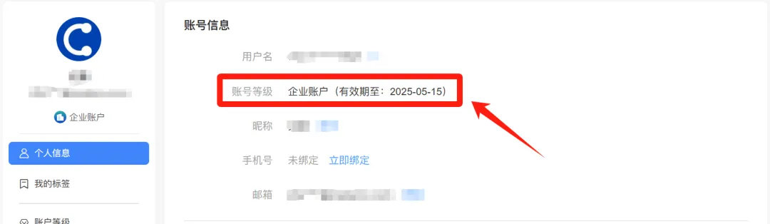或点击【个人信息】,可查看当前账户等级和账户有效期。