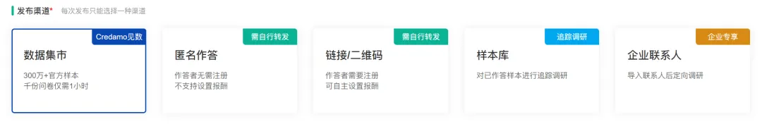 【3】参赛选手可根据项目选题与自身情况,通过账户设计问卷,并寻找相应渠道与被试,收集定性或定量数据;如果通过Credamo见数“数据集市”渠道收集数据,需要支付被试相应报酬;建议参赛选手可选择链接二维码渠道/匿名渠道发布问卷,无需产生任何费用,具体发布方式可参考平台说明与帮助文档。