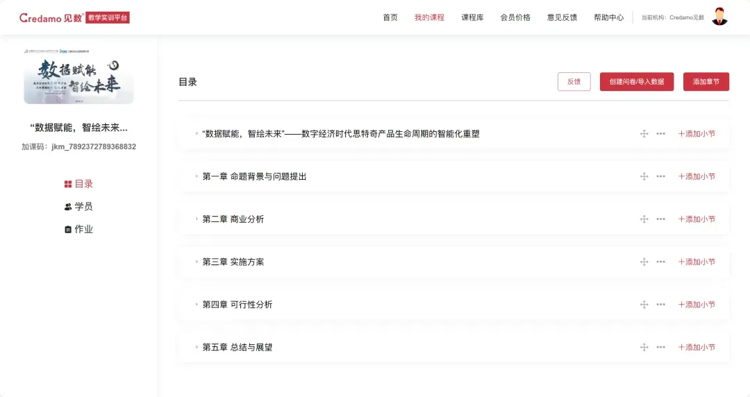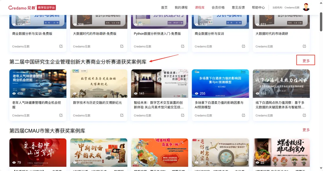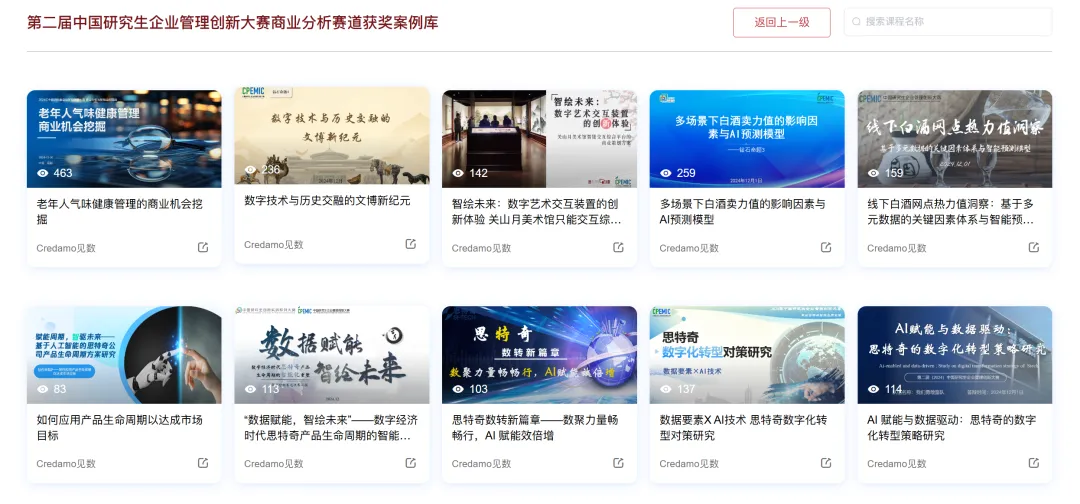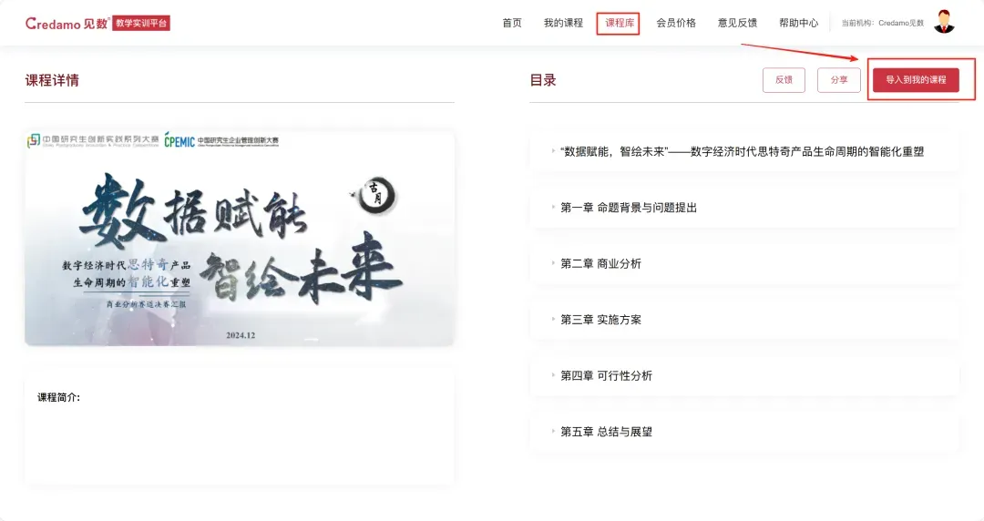 第三届中国研究生企业管理创新大赛-商业分析与实践赛道已于2025年9月19日正式结束报名,在报名阶段,执委会收到了很多有意向参加比赛的师生的反馈,希望可以学习往届获奖团队的作品,执委会现特将第二届商业分析赛道的70份总决赛团队的项目报告与答辩PPT开放给所有师生,供大家参考学习。第一步,登录教学实训平台:edu.credamo.com第二步,点击右上角课程库,找到【第二届中国研究生企业管理创新大赛商业分析赛道获奖案例库】,点击【更多】即可查看全部项目内容。第三步,找到想要保存的项目,点击【导入到我的课程】,在弹窗中直接点击【确定】,即可保存。第四步,添加到我的课程后,将自动跳转回【教师端】,或手动点击【我的课程】-【教师端】,即可查看刚刚保存的项目内容。