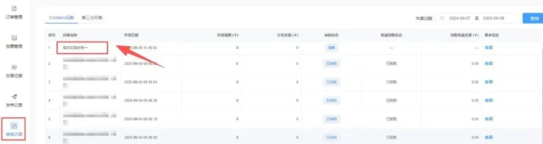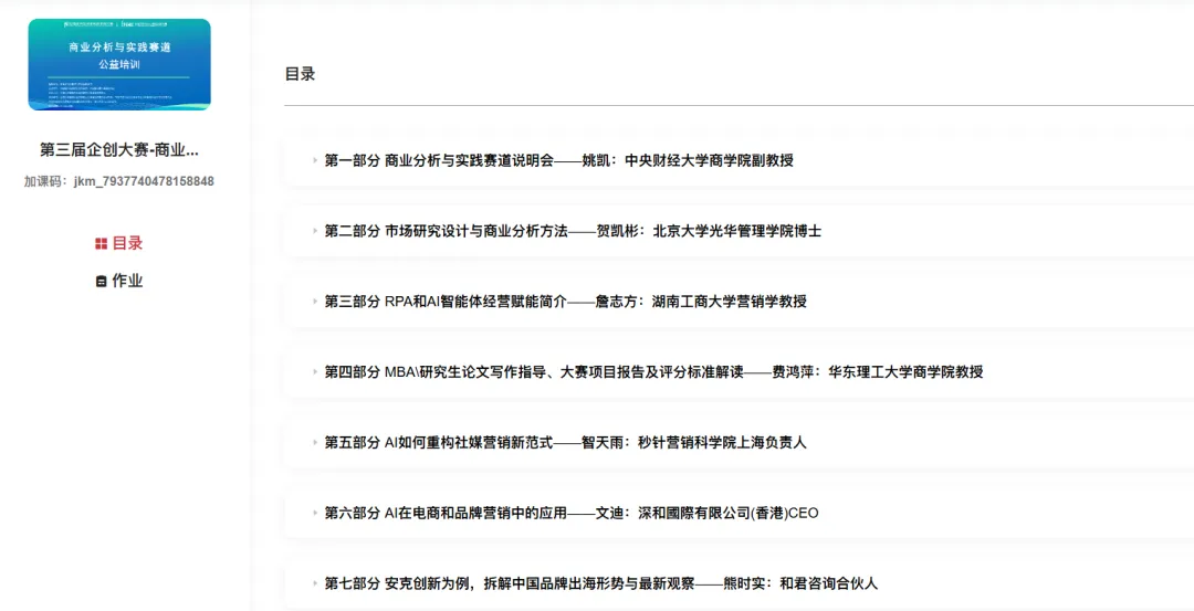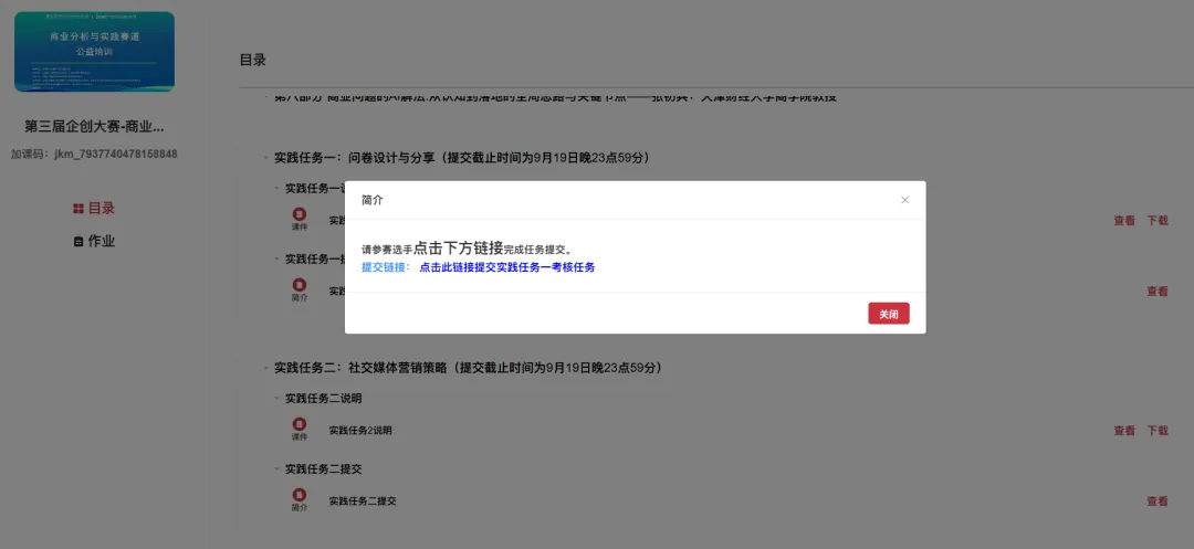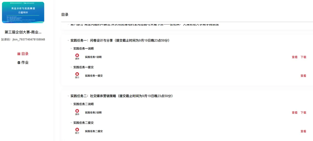 【1】参赛选手需注册登录教学实训平台:https://edu.credamo.com/【2】点击【我的课程】—【学生端】—【加入课程】,输入加课码后添加课程;【3】点击该课程,则可以看到公益培训课程PPT资料及考核任务。为提升参赛团队创新实践能力,提高大赛作品质量,帮助参赛队员在比赛过程中能够充分学习与掌握商业分析相关方法,商业分析赛道执委会特邀请学界和业界专家举办免费公益培训直播,并通过实践任务考核环节,帮助参赛选手熟悉后续作品提交流程,以及赛制新增评分标准—结果验证环节。培训考核:每位队员均须参加公益培训实践任务考核,提升商业分析与实践能力,提前熟悉作品提交流程。该考核任务占初赛成绩的5%(5分)。1.实践考核任务以个人为单位进行,团队每位成员均须完成;2.问卷设计及社媒平台内容发布,团队每位成员发布内容均须有所区别,不可发布相同内容;考核任务均须按照【实践任务说明】中的要求认真完成;3.参赛团队的所有参赛选手完成,则可获得初赛成绩的5%(5分),若参赛团队内有任一选手未完成,则团队不可获得该考核任务分数。4.考核任务截止时间延长为2025年9月24日晚23点59分。5.未组队成功的参赛选手可以先完成实践任务考核,再去寻找队友进行组队。【1】通过上方步骤添加课程后,将课程目录划至最下方,则可以看到考核任务,含考核任务说明及提交。【2】点击实践任务说明【查看】或【下载】按钮,则可查看考核任务详细说明。【3】点击实践任务提交【查看】按钮,则可进行考核任务提交。直接点击蓝色字体链接可跳转至提交通道。【1】登录Credamo见数官网:https://www.credamo.com/【2】点击菜单栏【订单发票】—【答卷记录】,可以找到实践任务提交记录则代表提交成功。