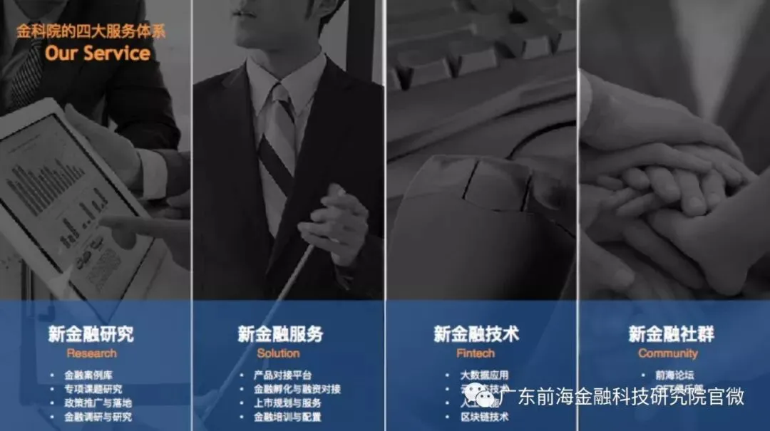 拥有“新金融研究、新金融服务、新金融技术、新金融社群”四大服务体系,与“新金融实验室、新金融基金、新金融论坛、新金融基地”四大实施路径,从理论研发到实践应用,实现研究成果的落地转化,可发掘企业的个性价值,为企业量身定制转型方案,有效解决传统企业在区块链时代转型升级的瓶颈难题,使企业真正通过自组织、自金融体系完成生态圈经济循环。