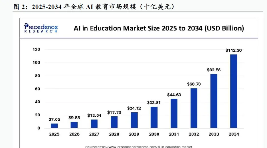 受益于日益增长的个性化学习体验需求,AI正在深刻变革全球教育行业,行业增速有望达到30%以上。根据GrandViewResearch的报告,2024年全球AI教育市场规模估计为58.8亿美元,预计到2030年将达到322.7亿美元,期间复合年增长率(CAGR)高达31.2%。另一家研究机构Precedence Research的数据也印证了这一趋势,其报告显示,2024年全球AI教育市场规模为51.8亿美元,预计到2025年将增至70.5亿美元,并有望在2034年达到1123亿美元,2025年至2034年的复合年增长率为36.02%。AI教育市场正处于高速发展阶段,市场需求旺盛,增长空间广阔。高增长的主要驱动力包括对个性化学习体验日益增长的需求,以及学校和机构越来越多地利用AI驱动的工具,如智能辅导系统、聊天机器人和学习分析,来增强学生参与度和优化教学方法,同时政府在教育方面的支出也推动AI教育市场需求.