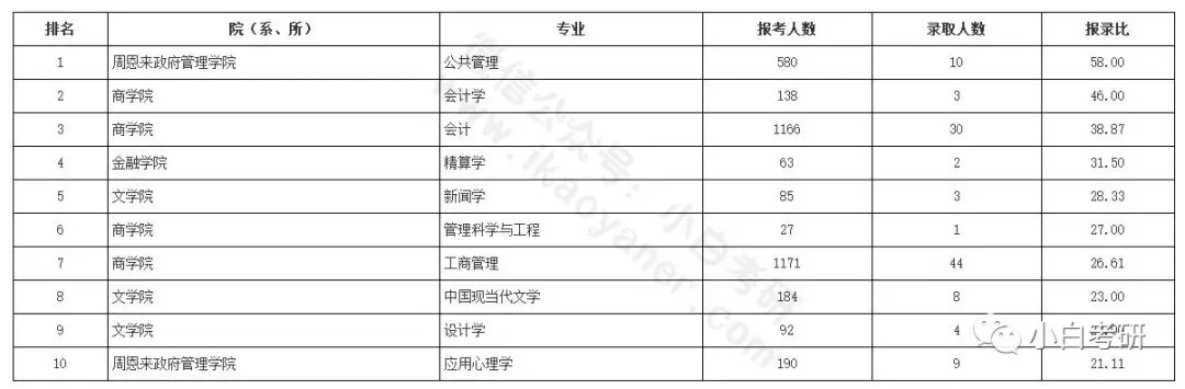 研招网给出了4所热门高校(人大、复旦、南开、浙大)报录比排名前10的专业: