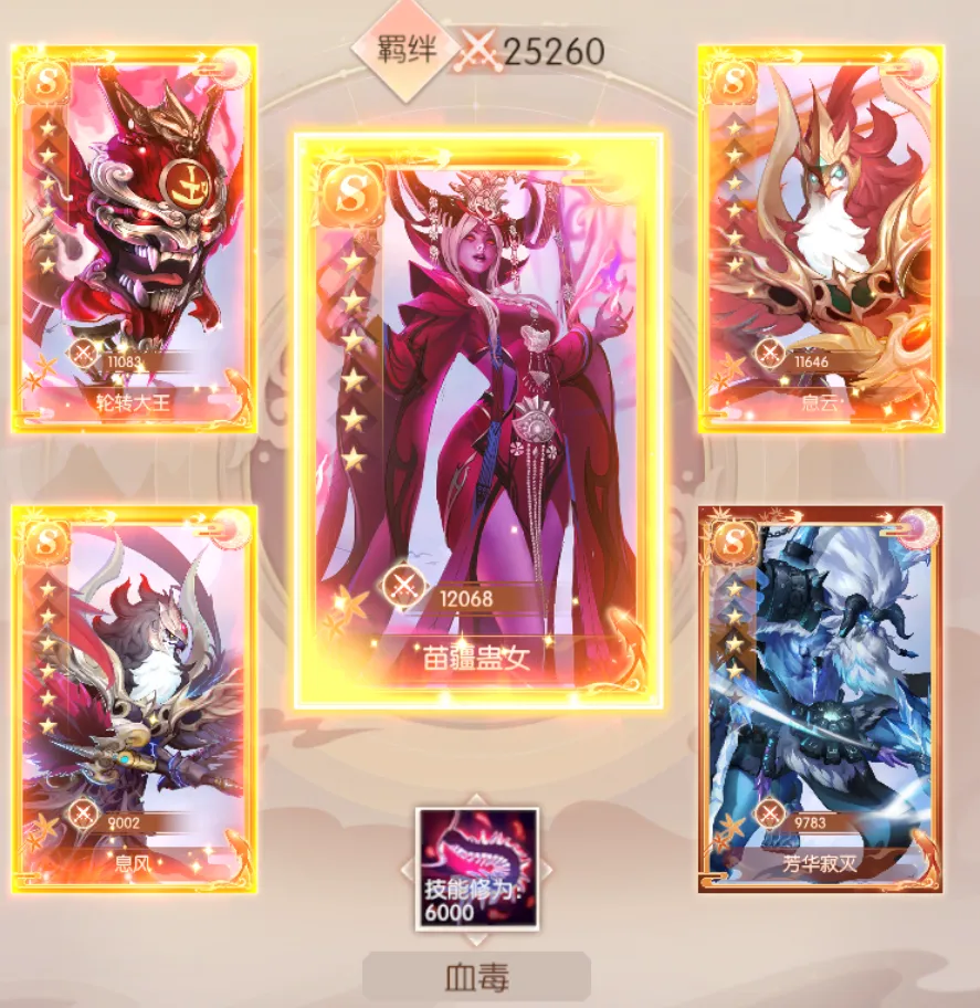 主位蛊女范围伤害不俗,羁绊5条其中4条都很契合输出职业,还有一条减伤也是很好的属性,关键是性价比极高,每天18礼包加巅峰兑换就可轻松获得,只是需要慢慢养大。 |