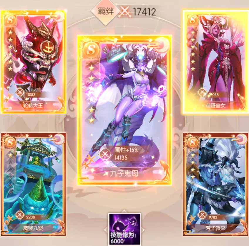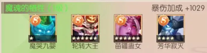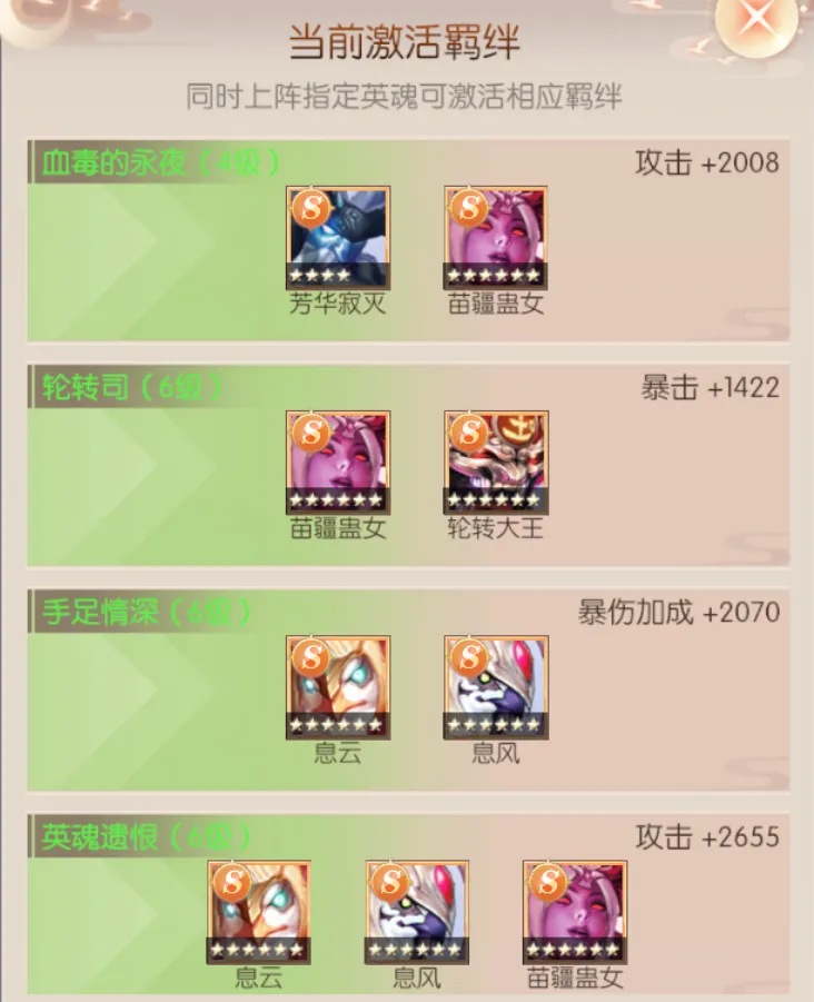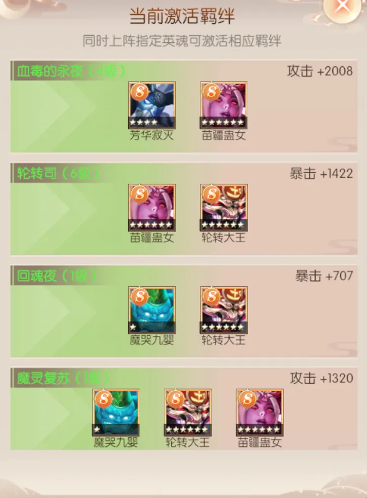 英魂和天书差不多,也是尽量收集,上阵5个,但与天书自由搭配不同的是只有主位英魂有技能且有上阵羁绊,所以搭配的目的就是最大化5个上阵英魂的羁绊属性收益。这里我就只介绍两种性价比较高的搭配。