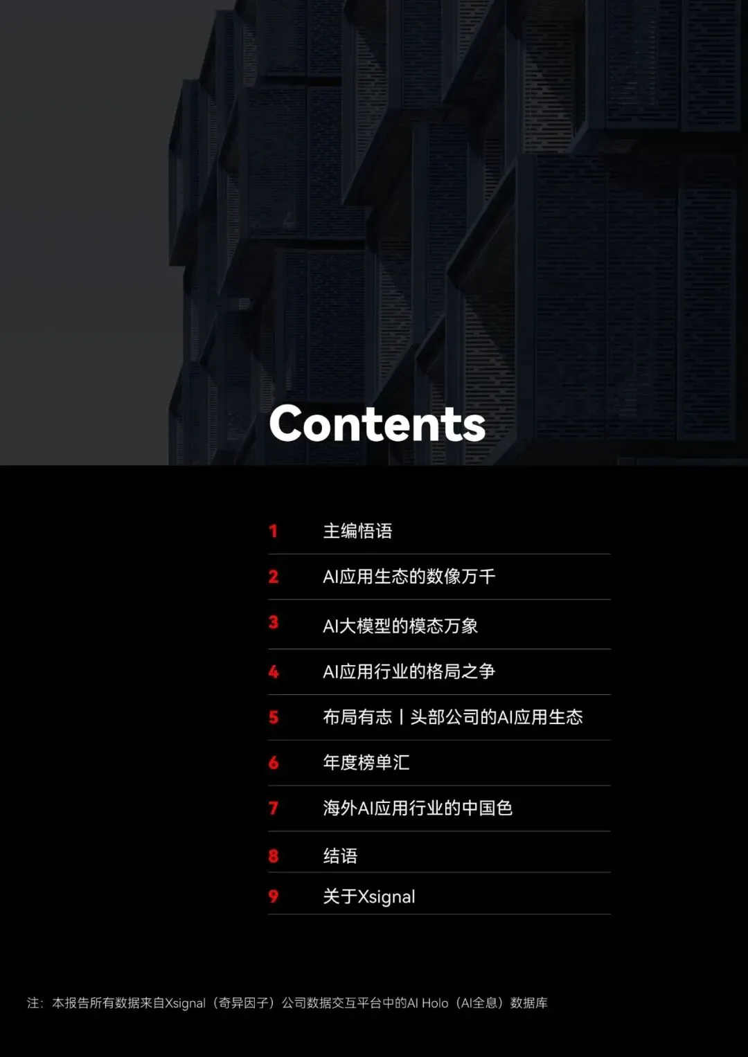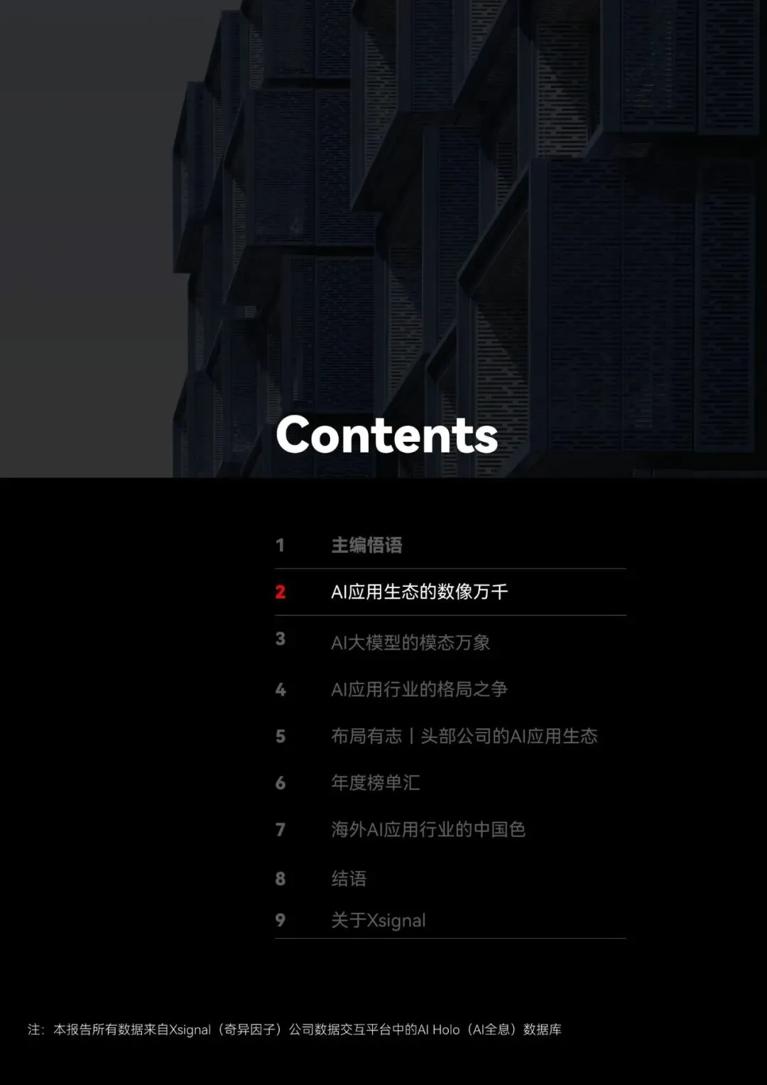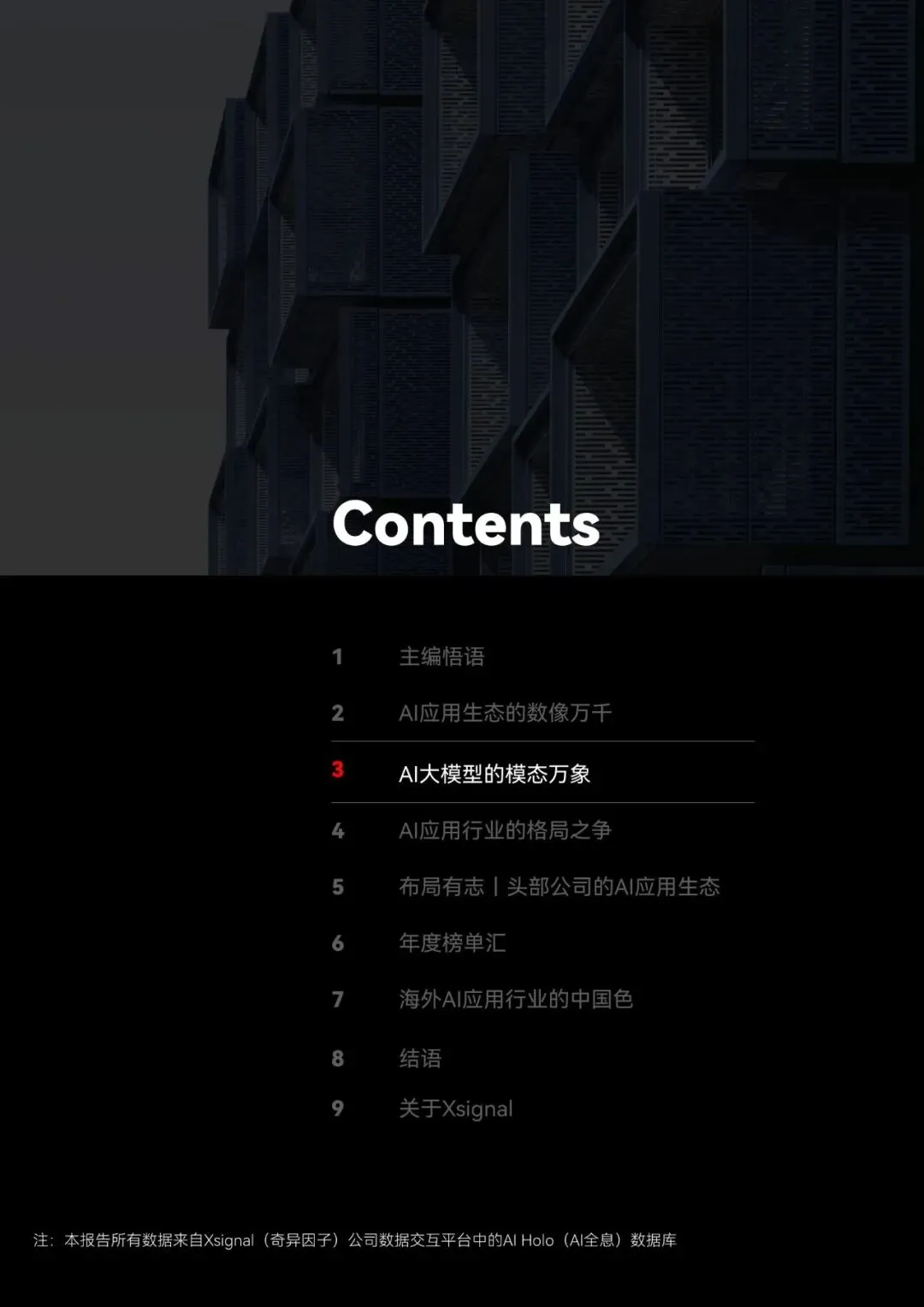 报告分为多个章节,涵盖中国和海外AI应用行业纵览、细分赛道发展、头部公司布局、年度榜单等。数据显示,AI应用已从聊天机器人向多元场景拓展,如视频生成、办公效率提升等,且从短时任务向长程任务跨越。AI大模型的模态万象和应用生态的数像万千成为行业发展的关键特征。