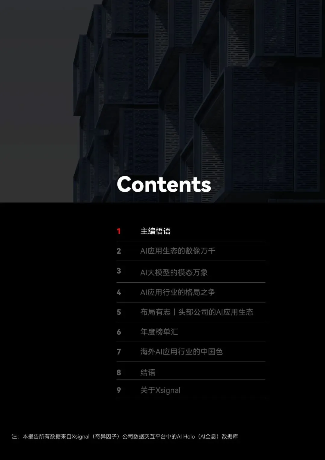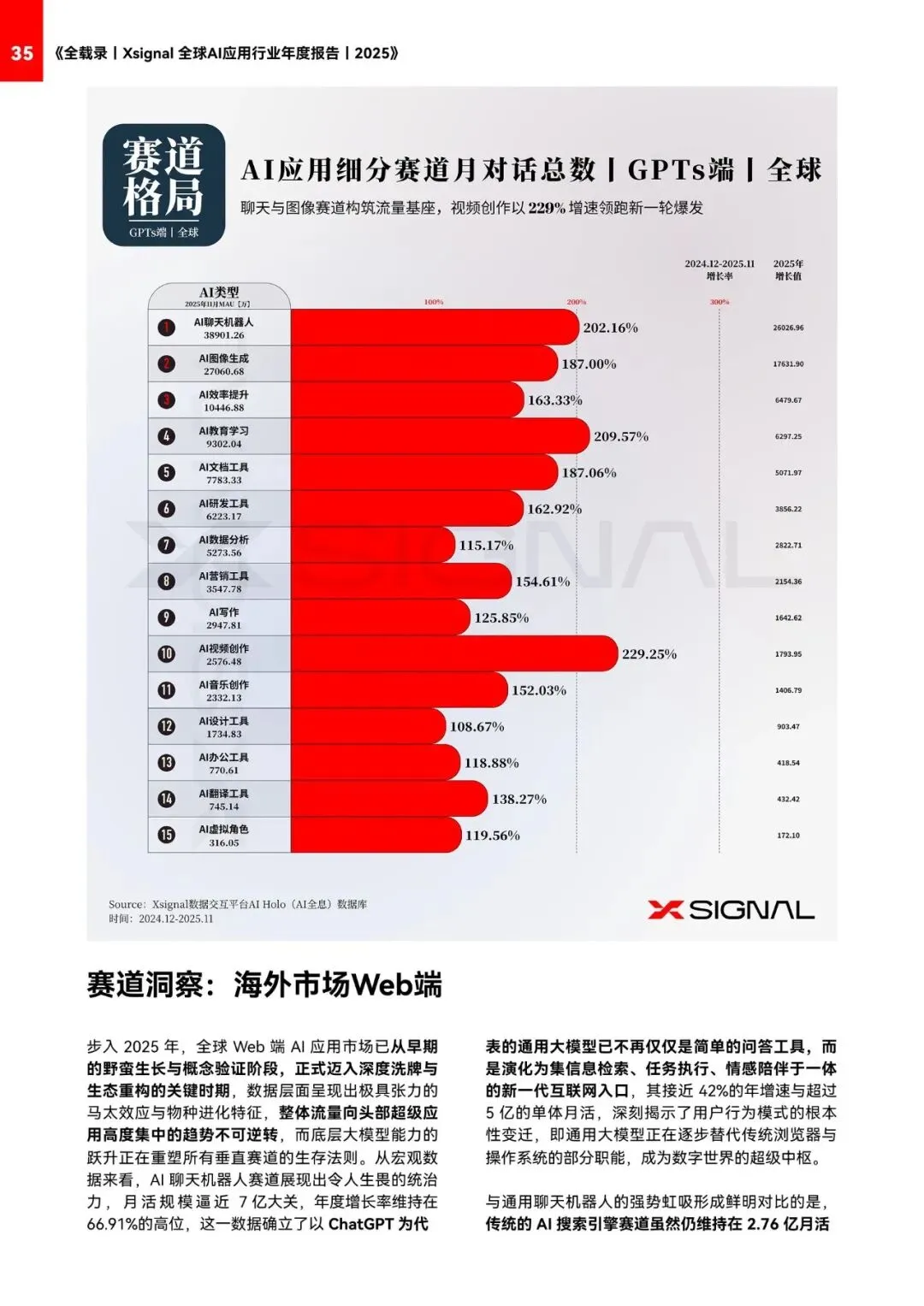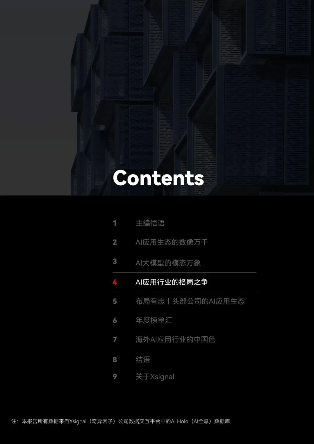 报告分为多个章节,涵盖中国和海外AI应用行业纵览、细分赛道发展、头部公司布局、年度榜单等。数据显示,AI应用已从聊天机器人向多元场景拓展,如视频生成、办公效率提升等,且从短时任务向长程任务跨越。AI大模型的模态万象和应用生态的数像万千成为行业发展的关键特征。