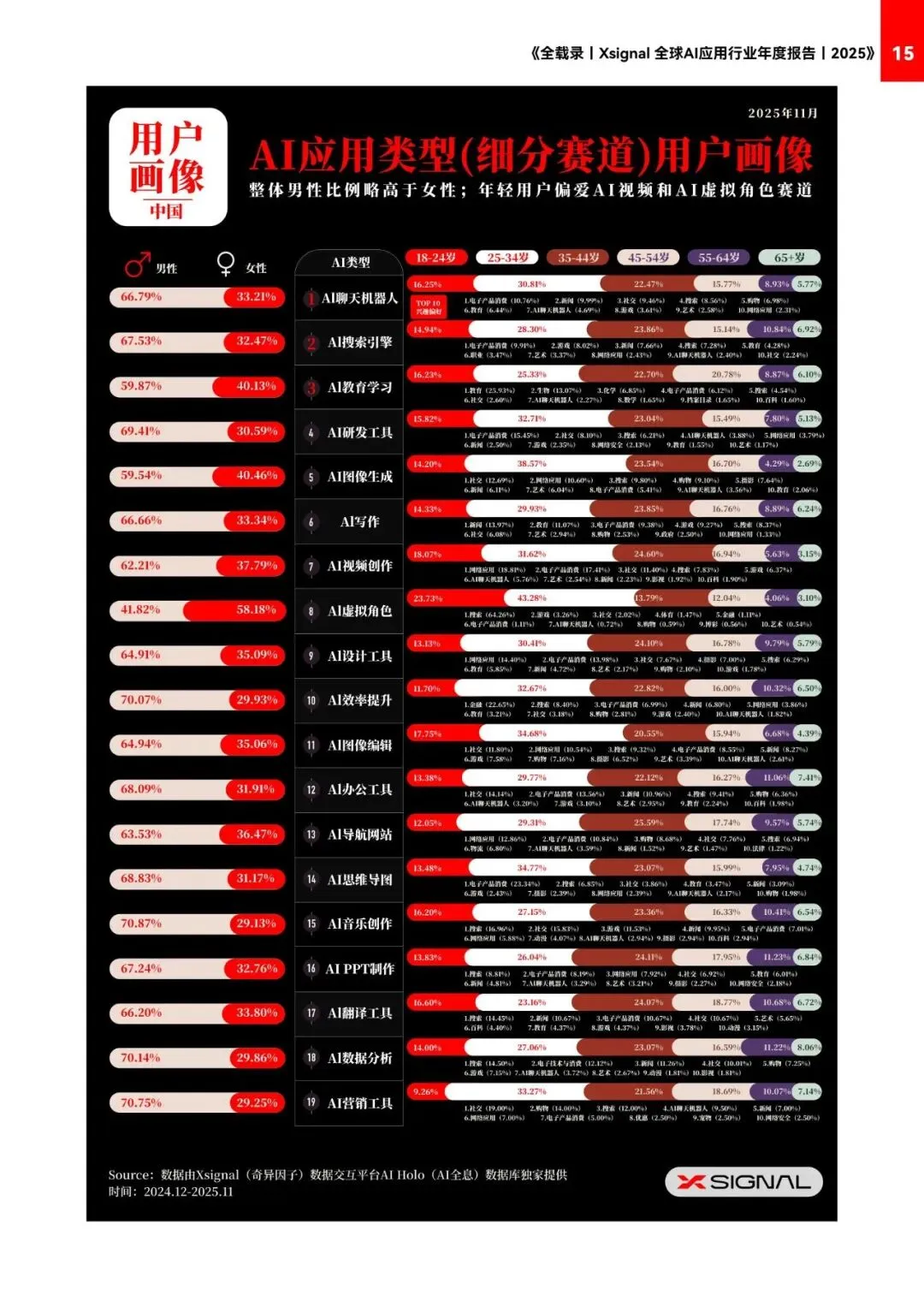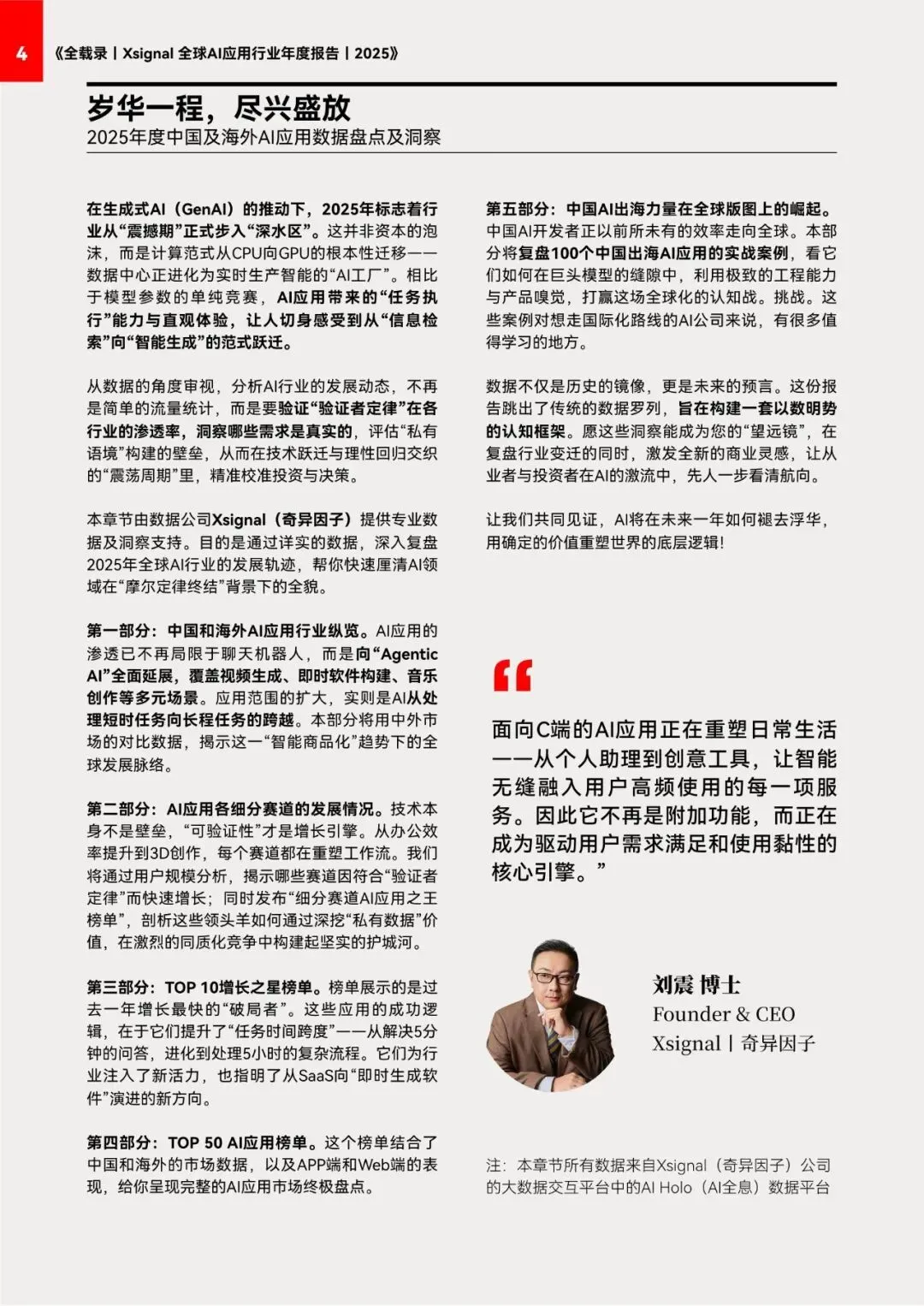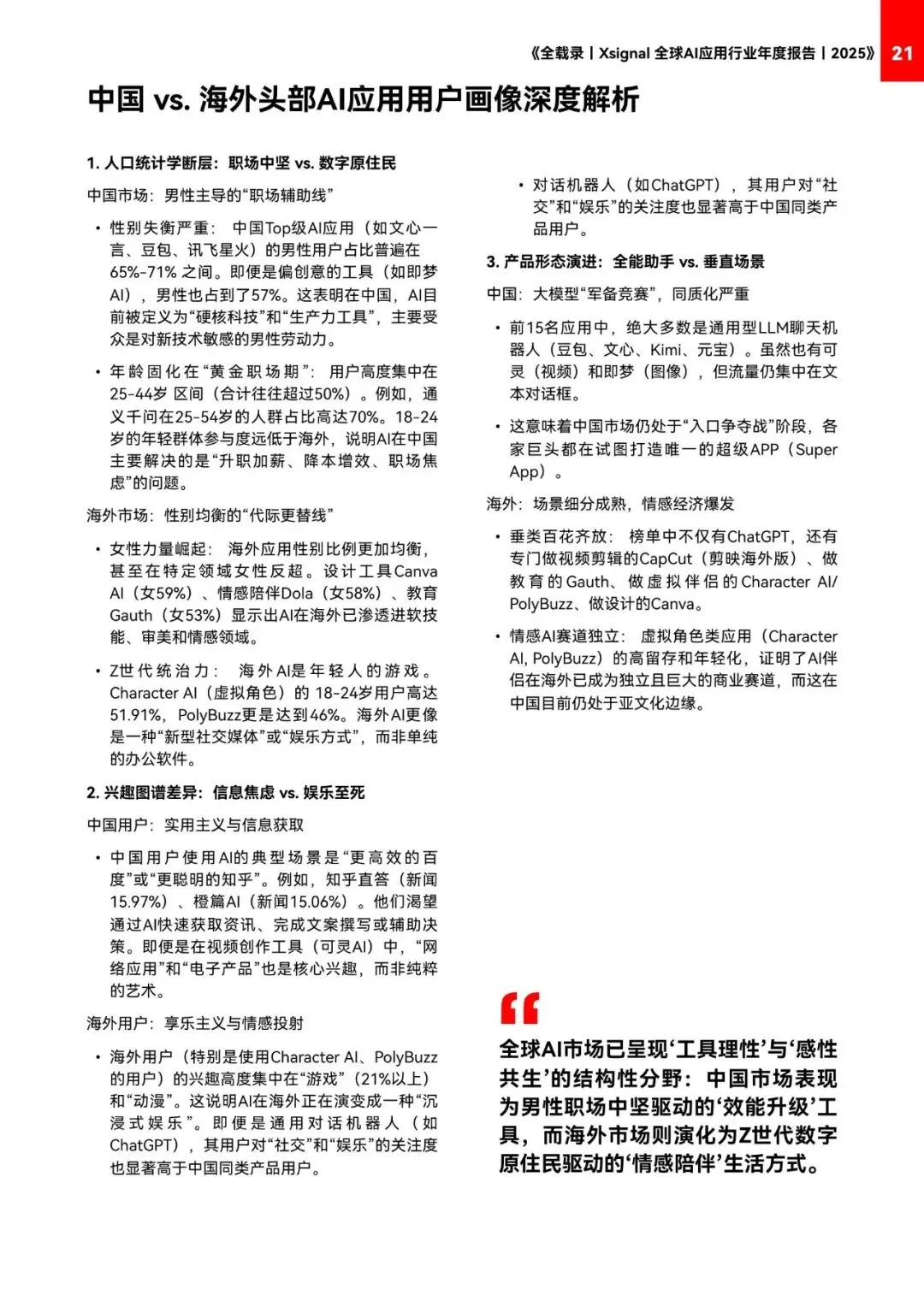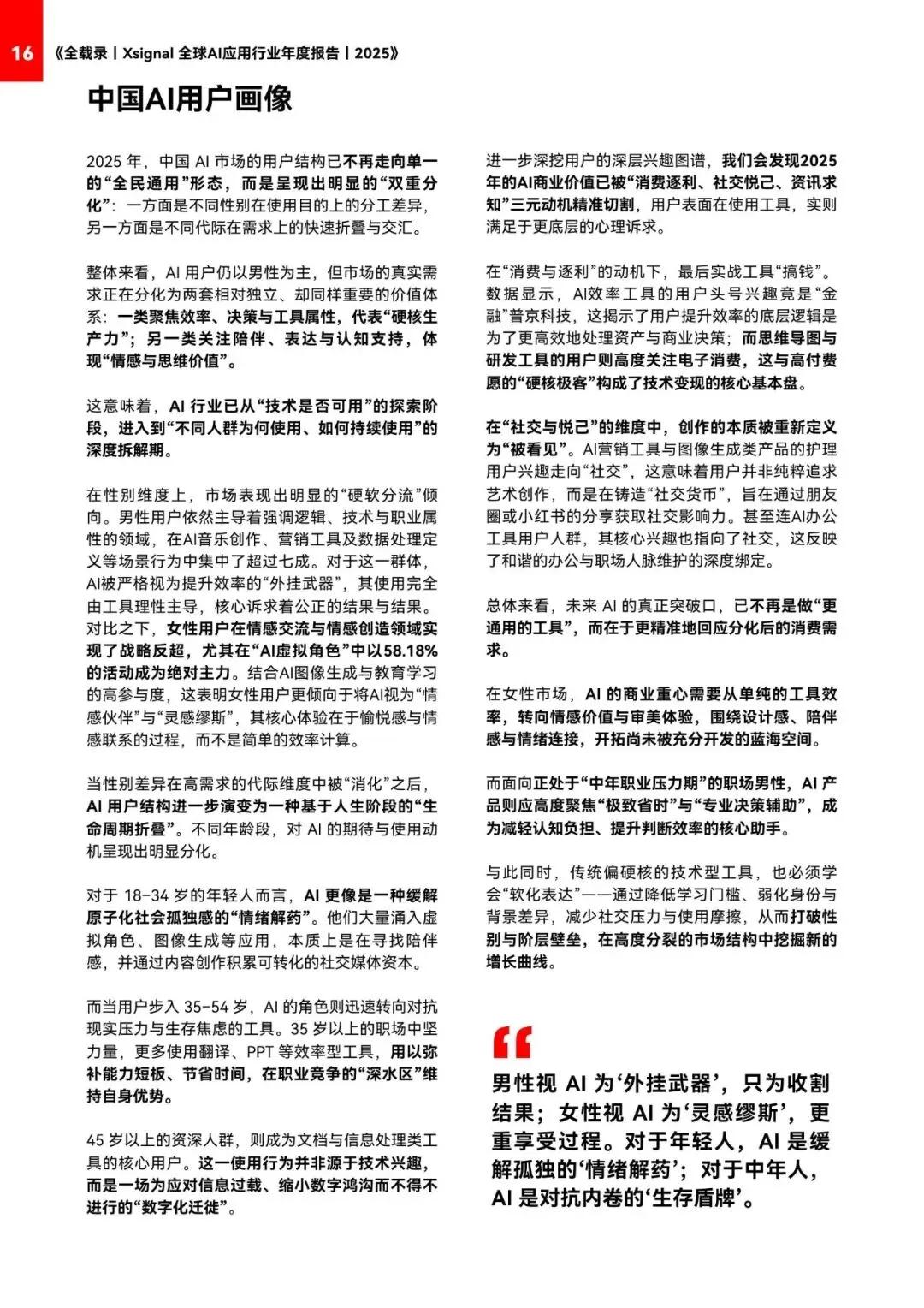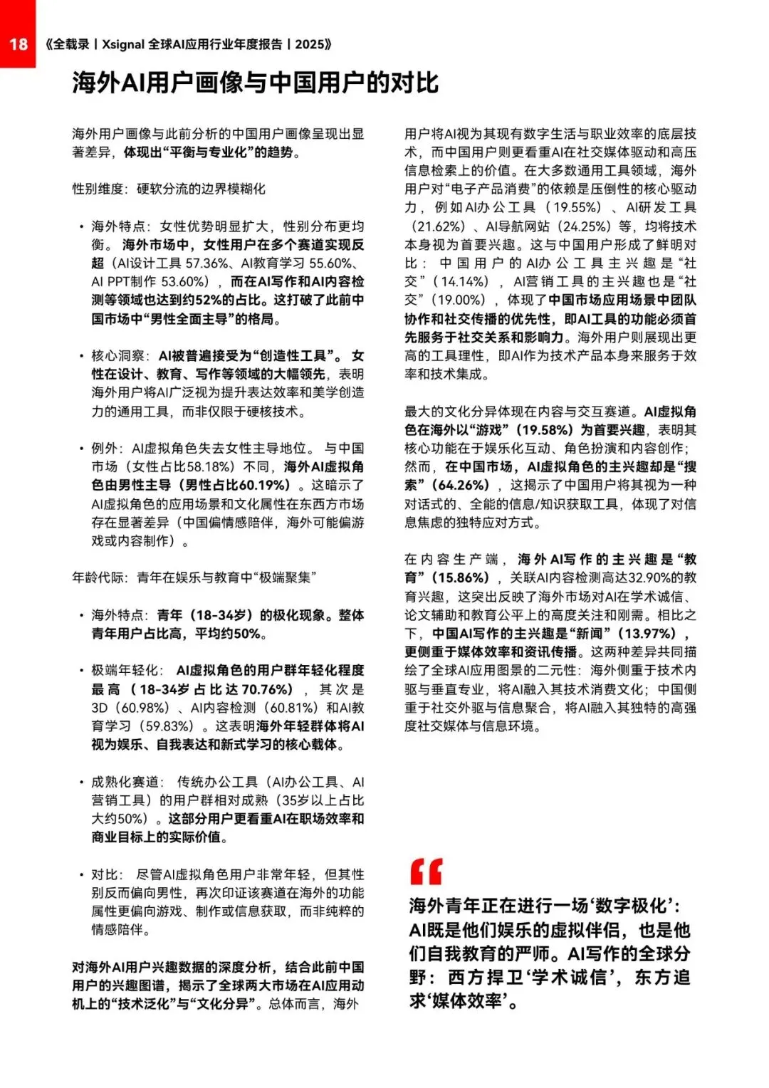 报告还关注了中国AI出海力量的崛起,分析了100个中国出海AI应用的实战案例,展示了中国开发者如何利用工程能力和产品觉在全球市场取得成功。此外,报告通过用户画像揭示了AI应用的核心用户群体及其需求,为行业从业者和投资者提供了深刻的市场洞察。