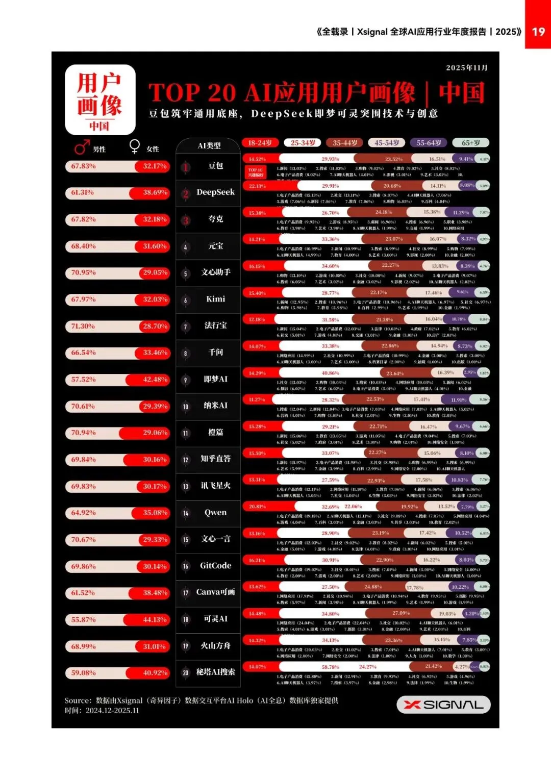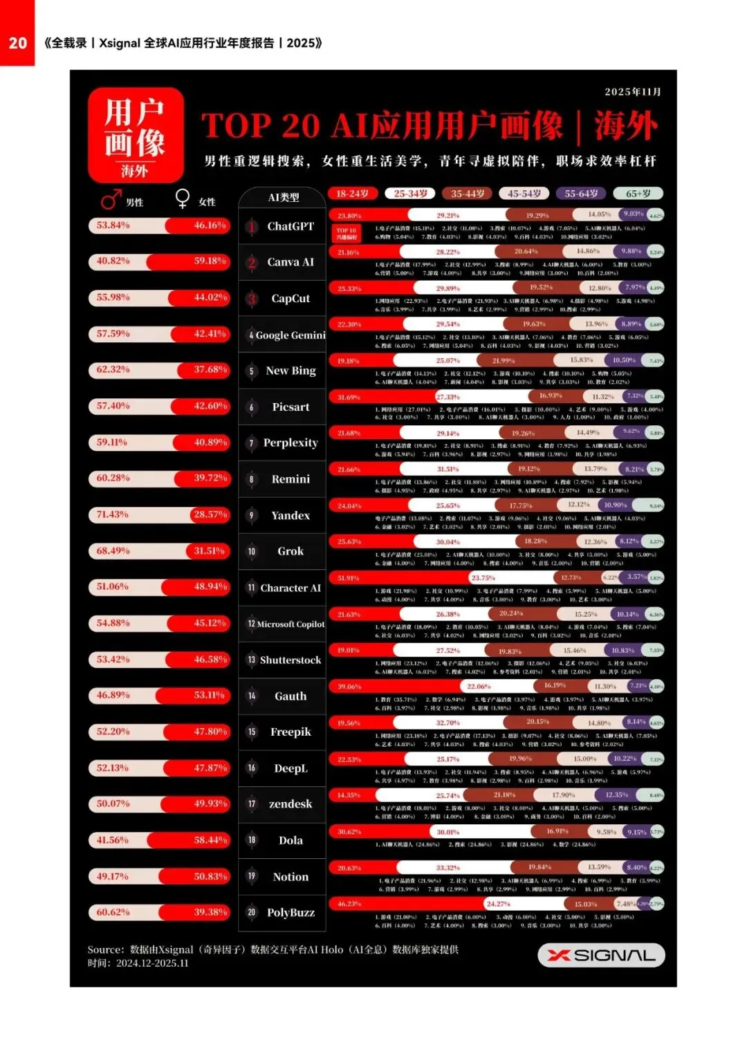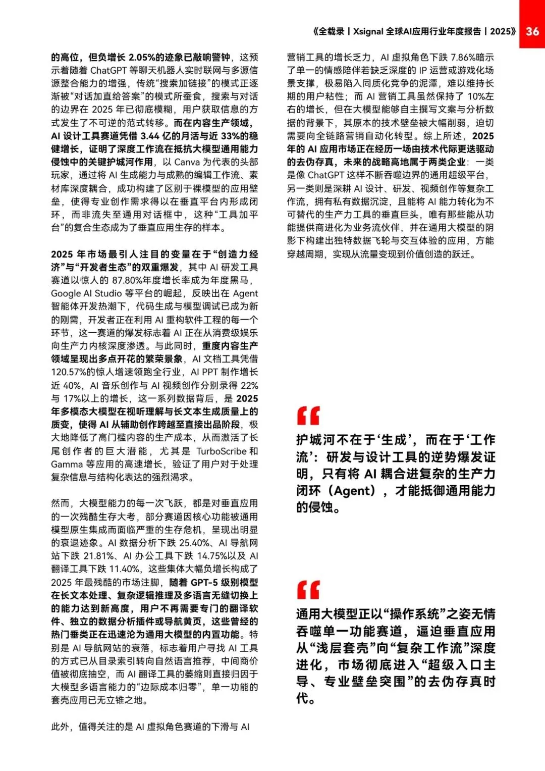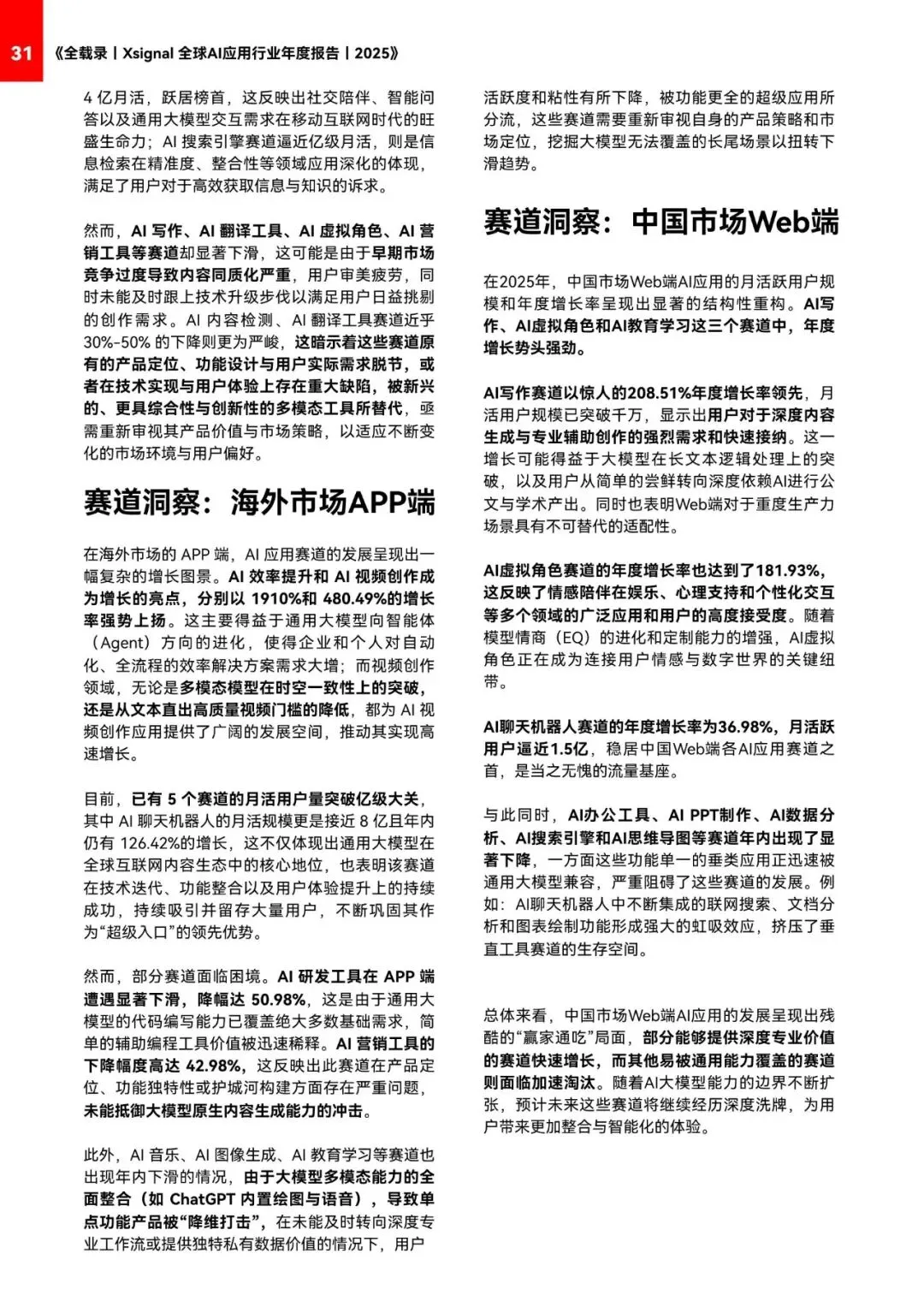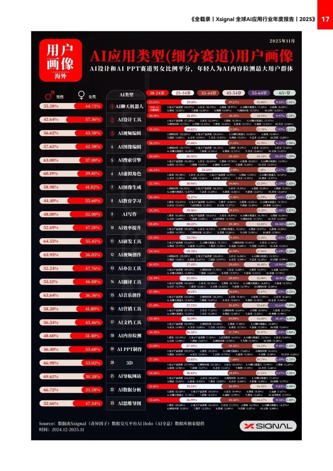 报告还关注了中国AI出海力量的崛起,分析了100个中国出海AI应用的实战案例,展示了中国开发者如何利用工程能力和产品觉在全球市场取得成功。此外,报告通过用户画像揭示了AI应用的核心用户群体及其需求,为行业从业者和投资者提供了深刻的市场洞察。