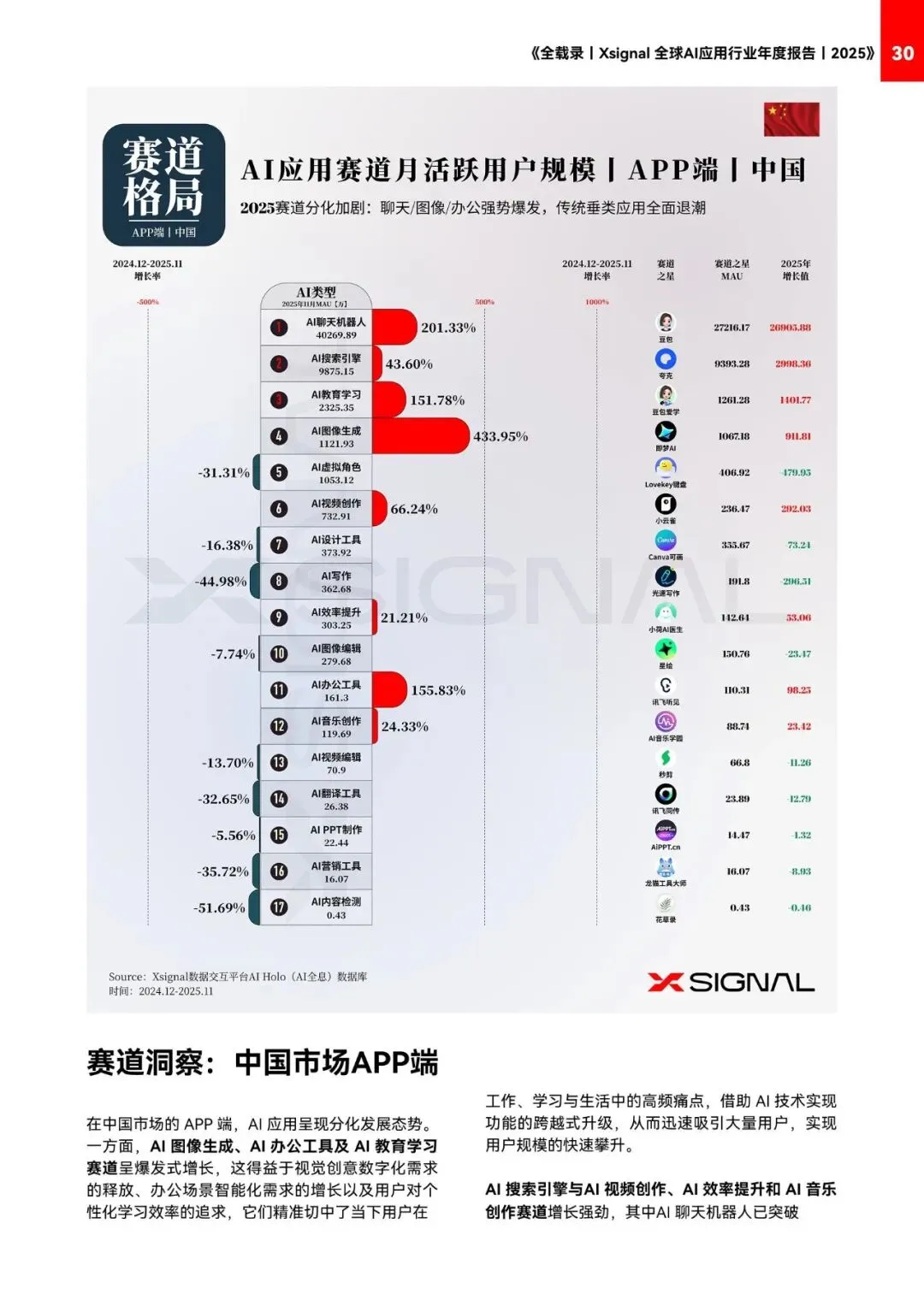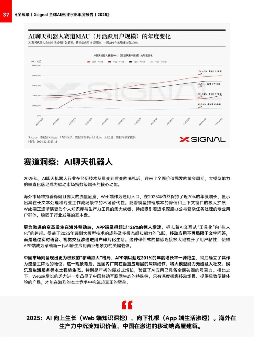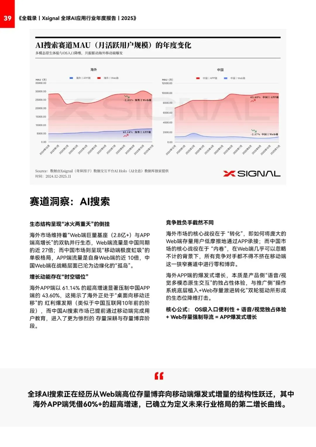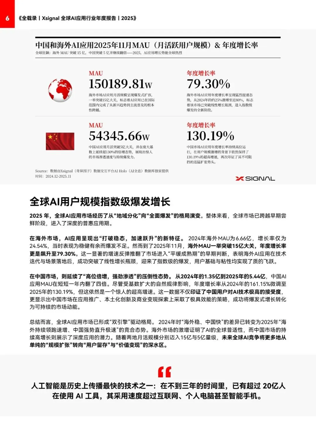 2025年AI应用行业从“震撼期”步入“深水区”,全球月活跃用户规模(MAU)显著增长,海外市场突破15亿,中国市场达5亿,增速分别达79.30%和130.19%。
