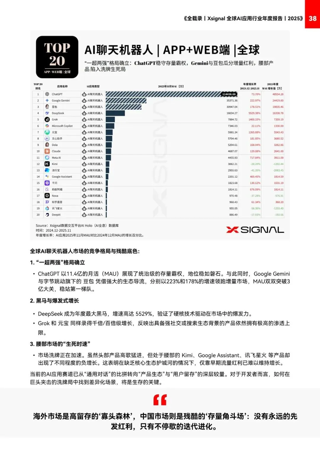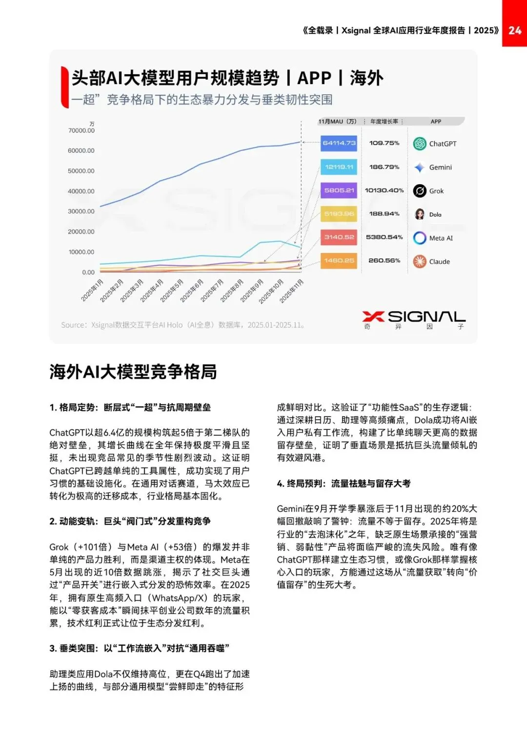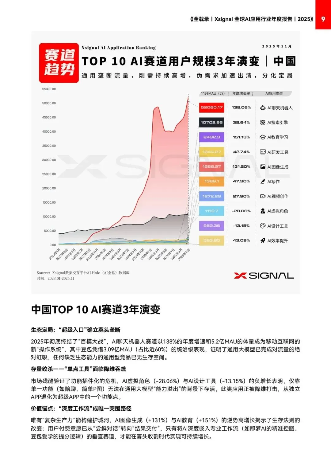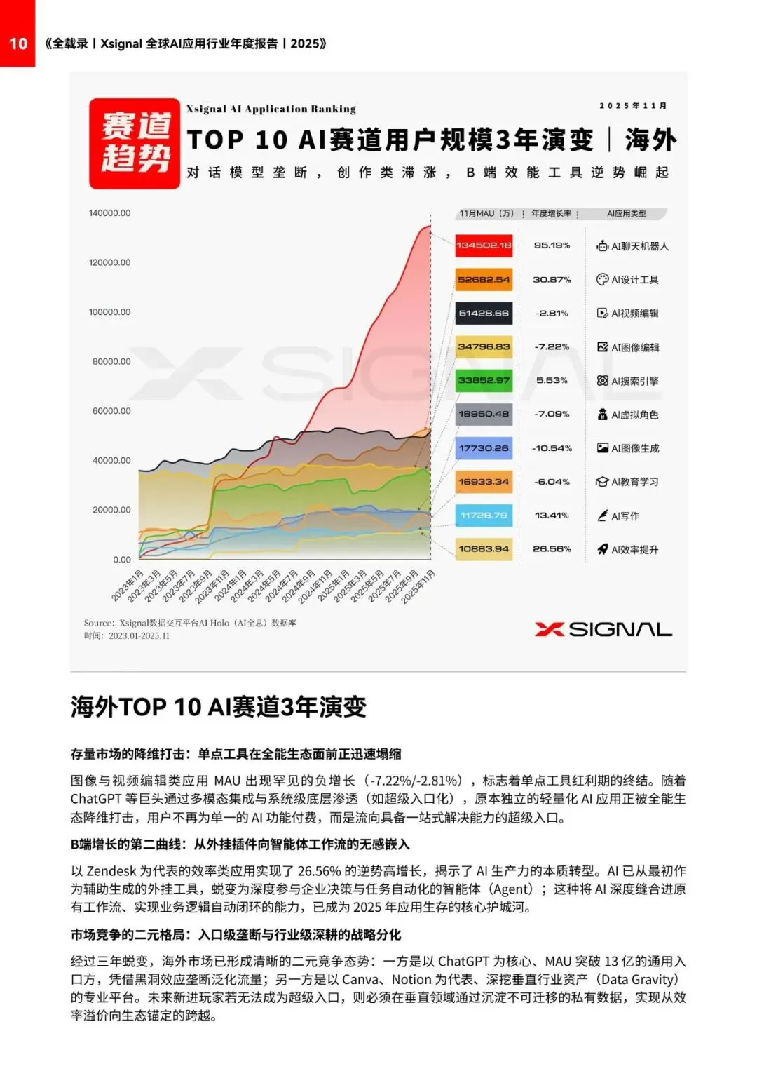 2025年AI应用行业从“震撼期”步入“深水区”,全球月活跃用户规模(MAU)显著增长,海外市场突破15亿,中国市场达5亿,增速分别达79.30%和130.19%。