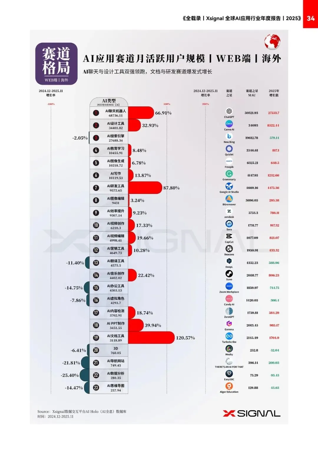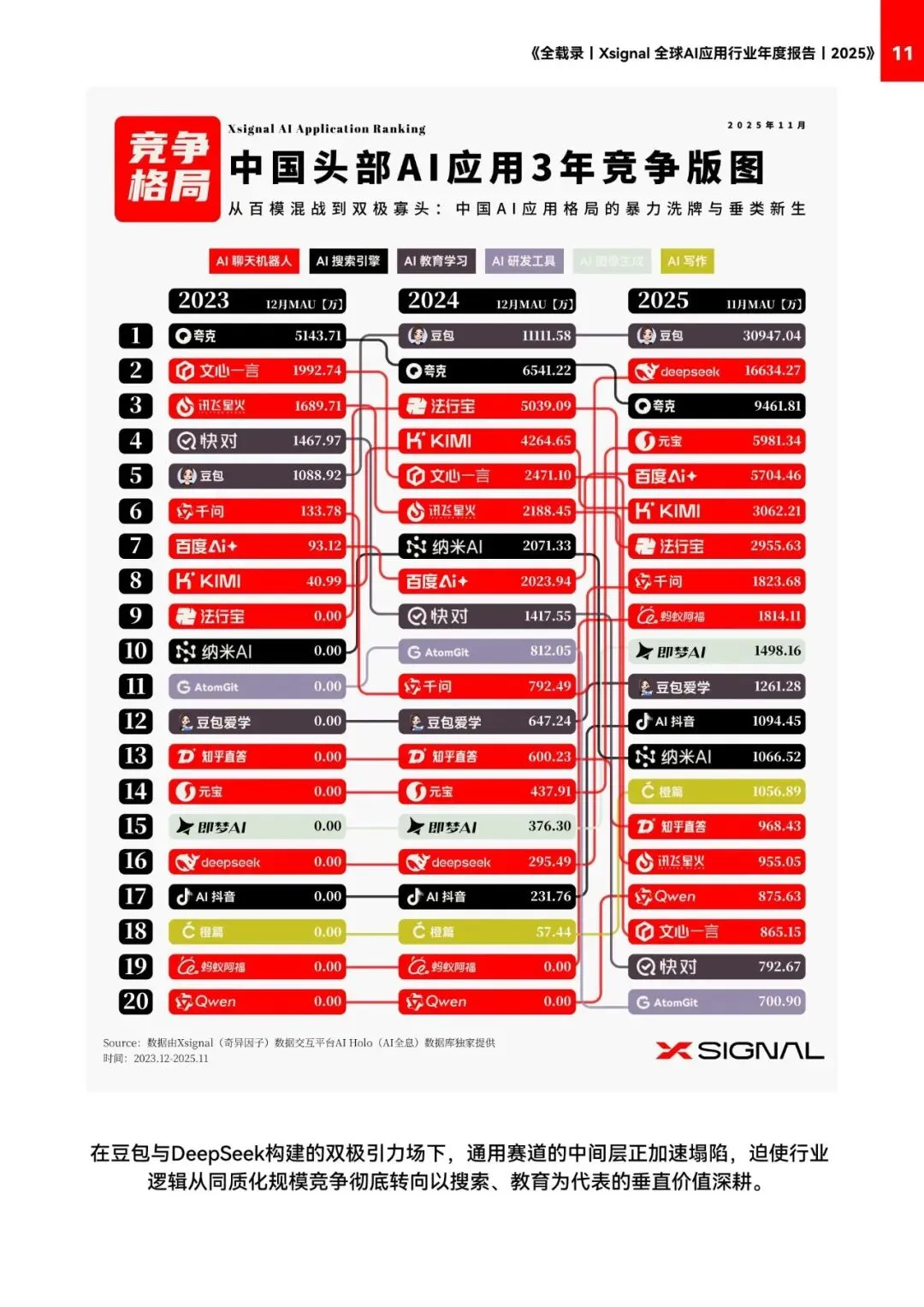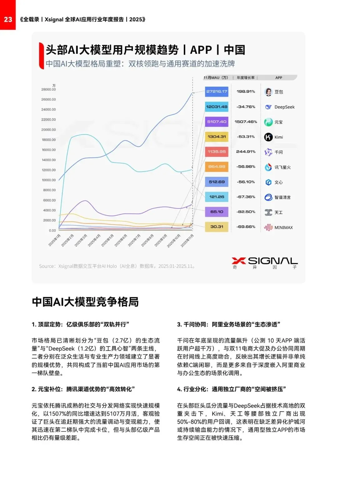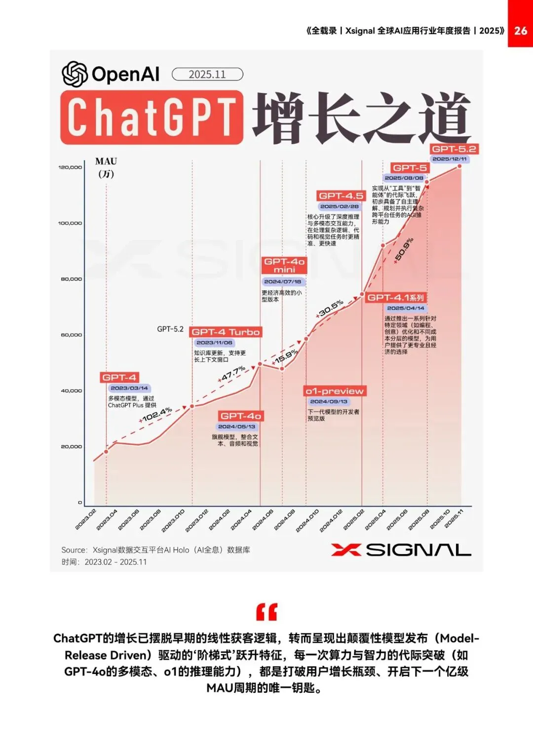 2025年AI应用行业从“震撼期”步入“深水区”,全球月活跃用户规模(MAU)显著增长,海外市场突破15亿,中国市场达5亿,增速分别达79.30%和130.19%。
