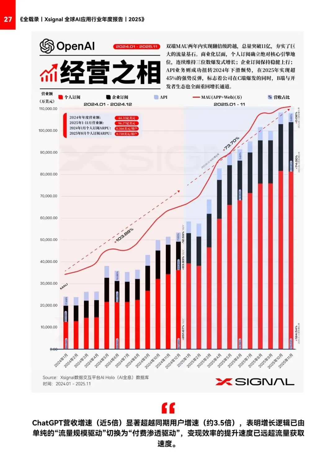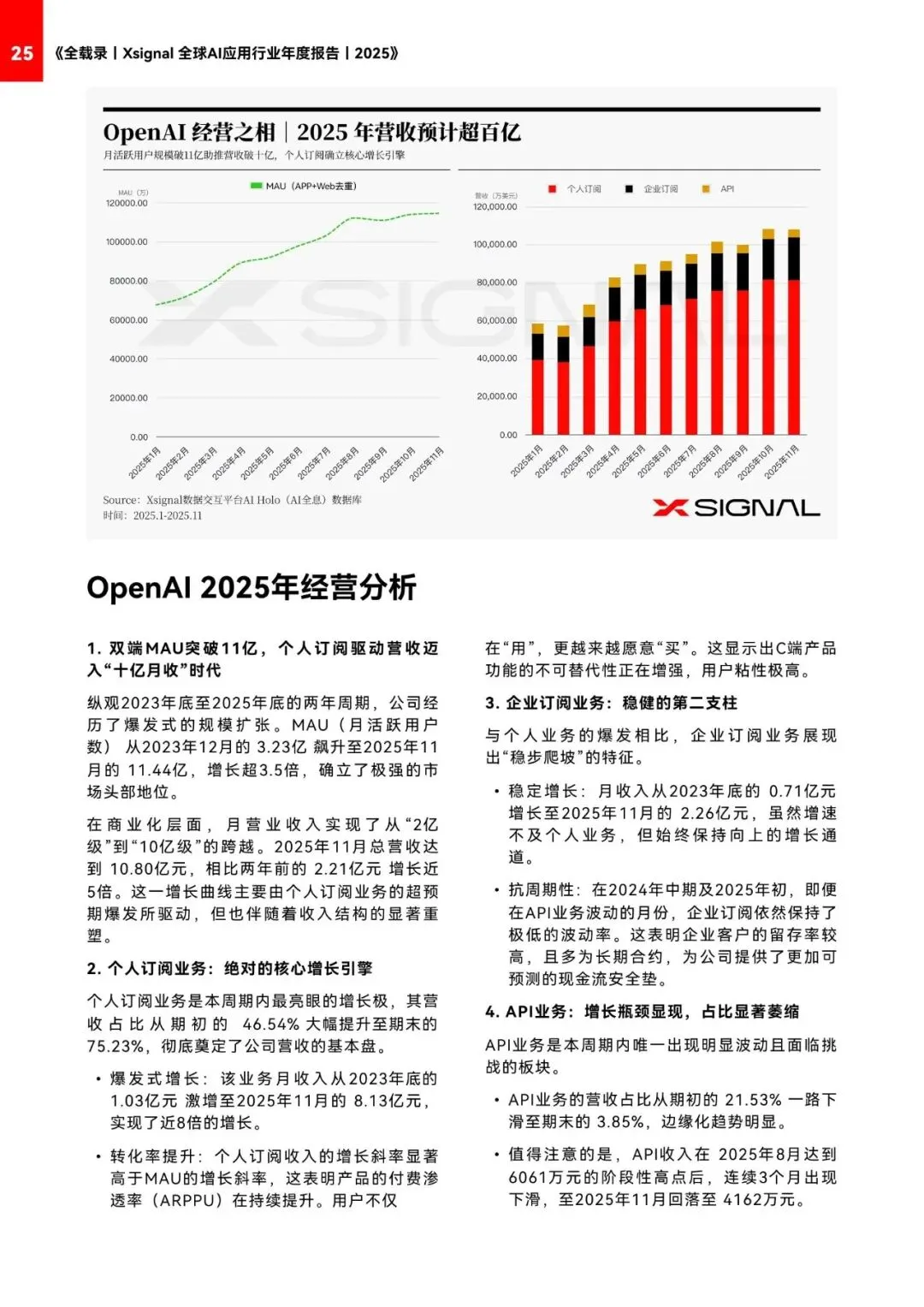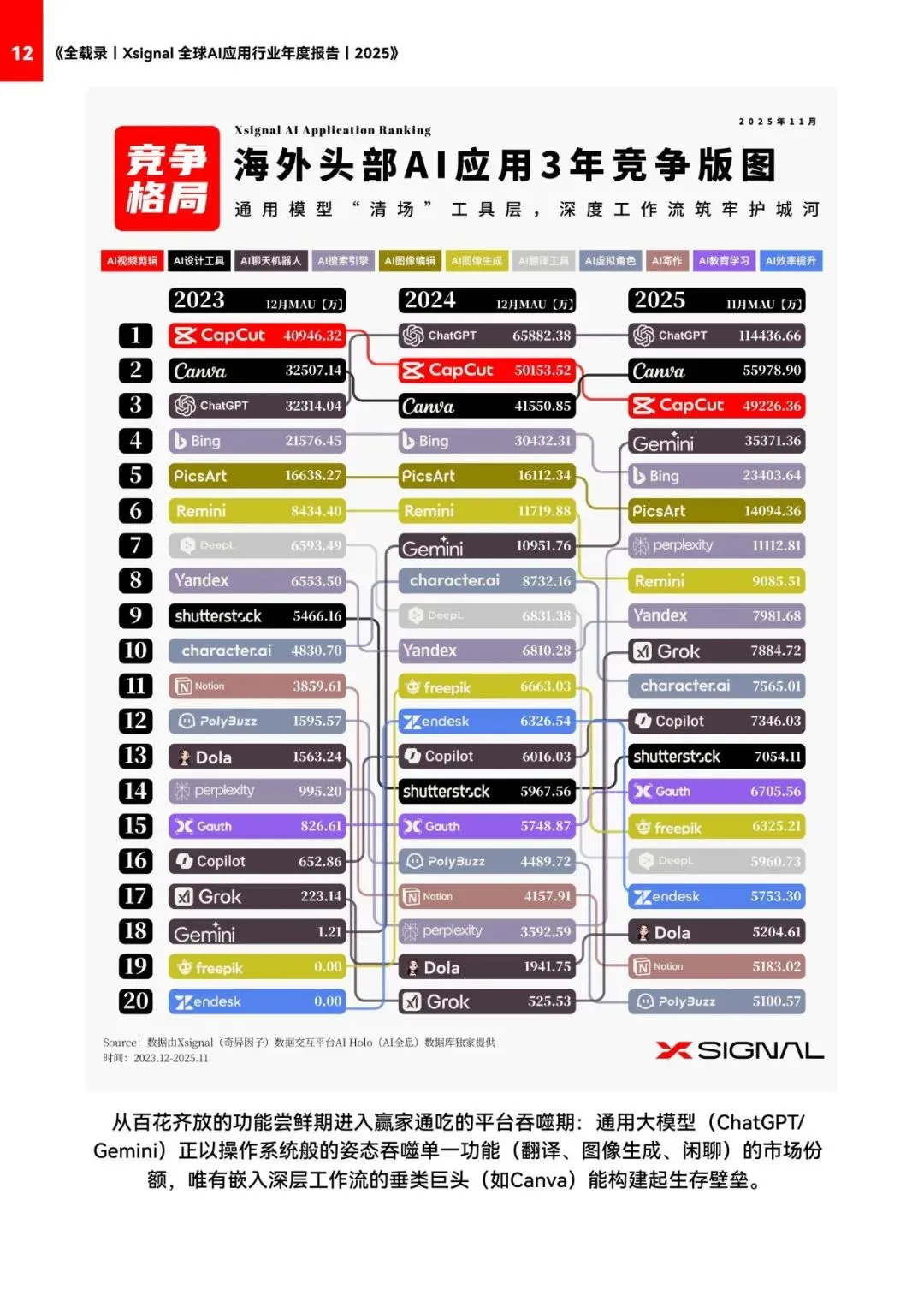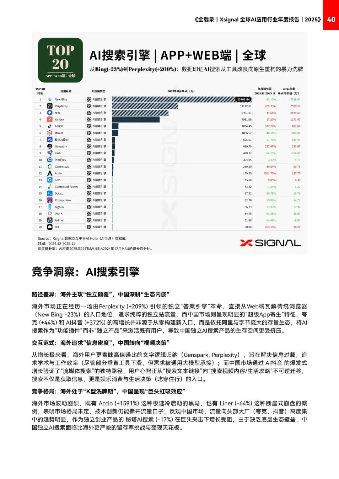 2025年AI应用行业从“震撼期”步入“深水区”,全球月活跃用户规模(MAU)显著增长,海外市场突破15亿,中国市场达5亿,增速分别达79.30%和130.19%。