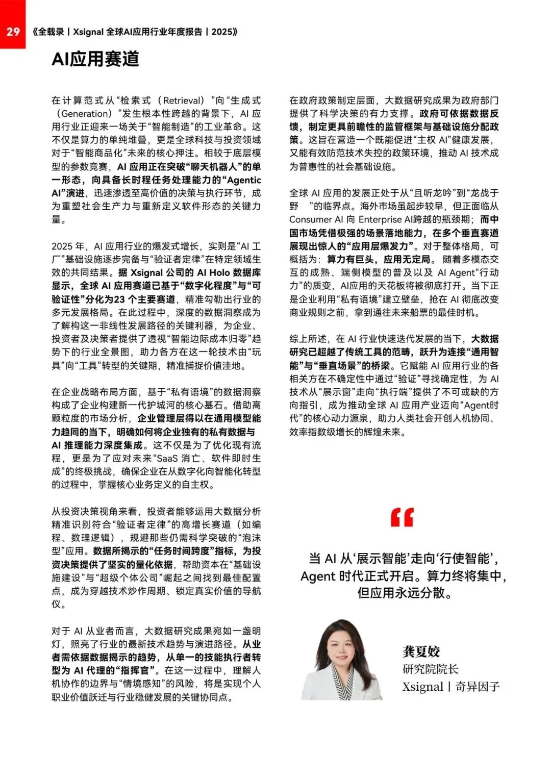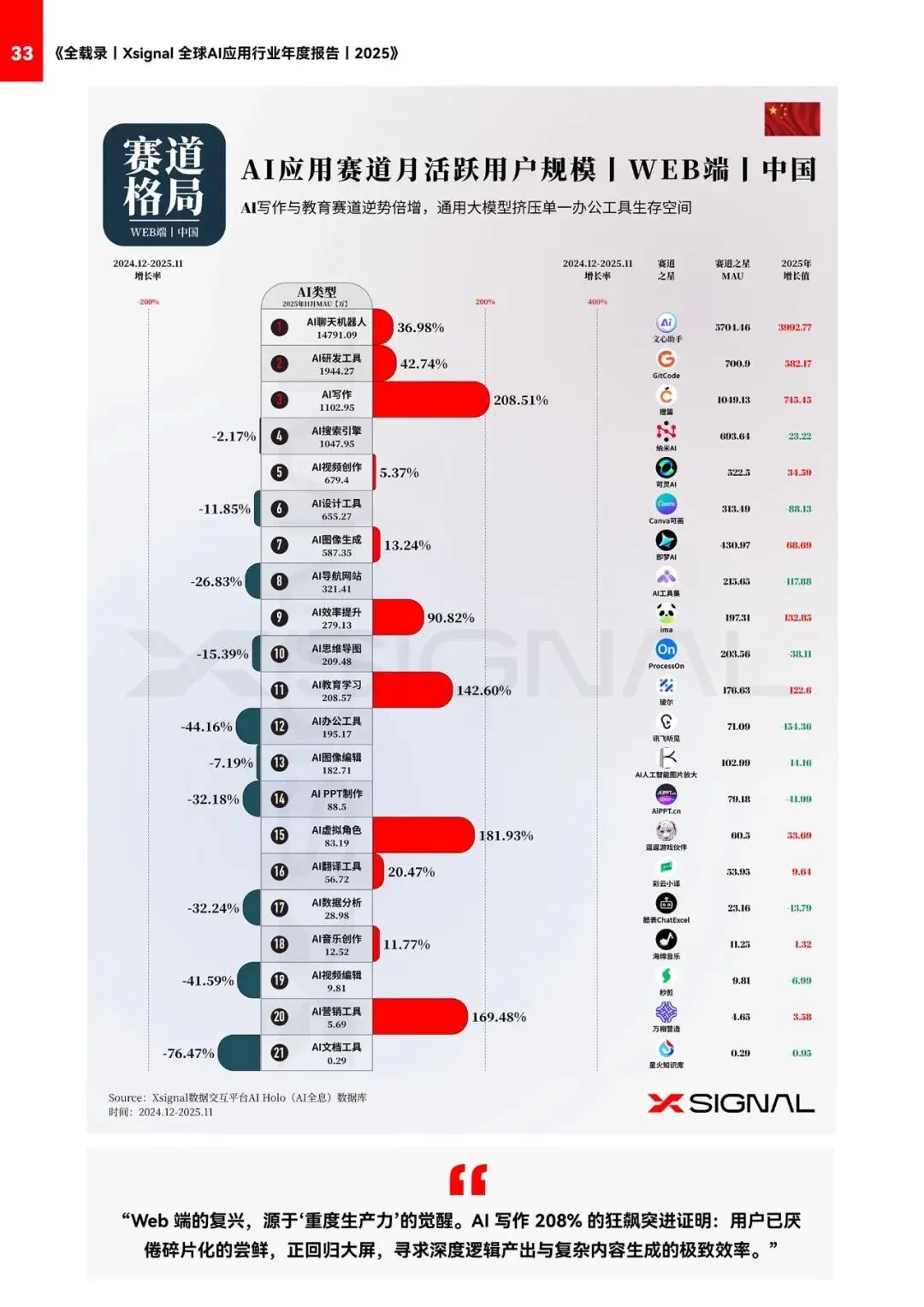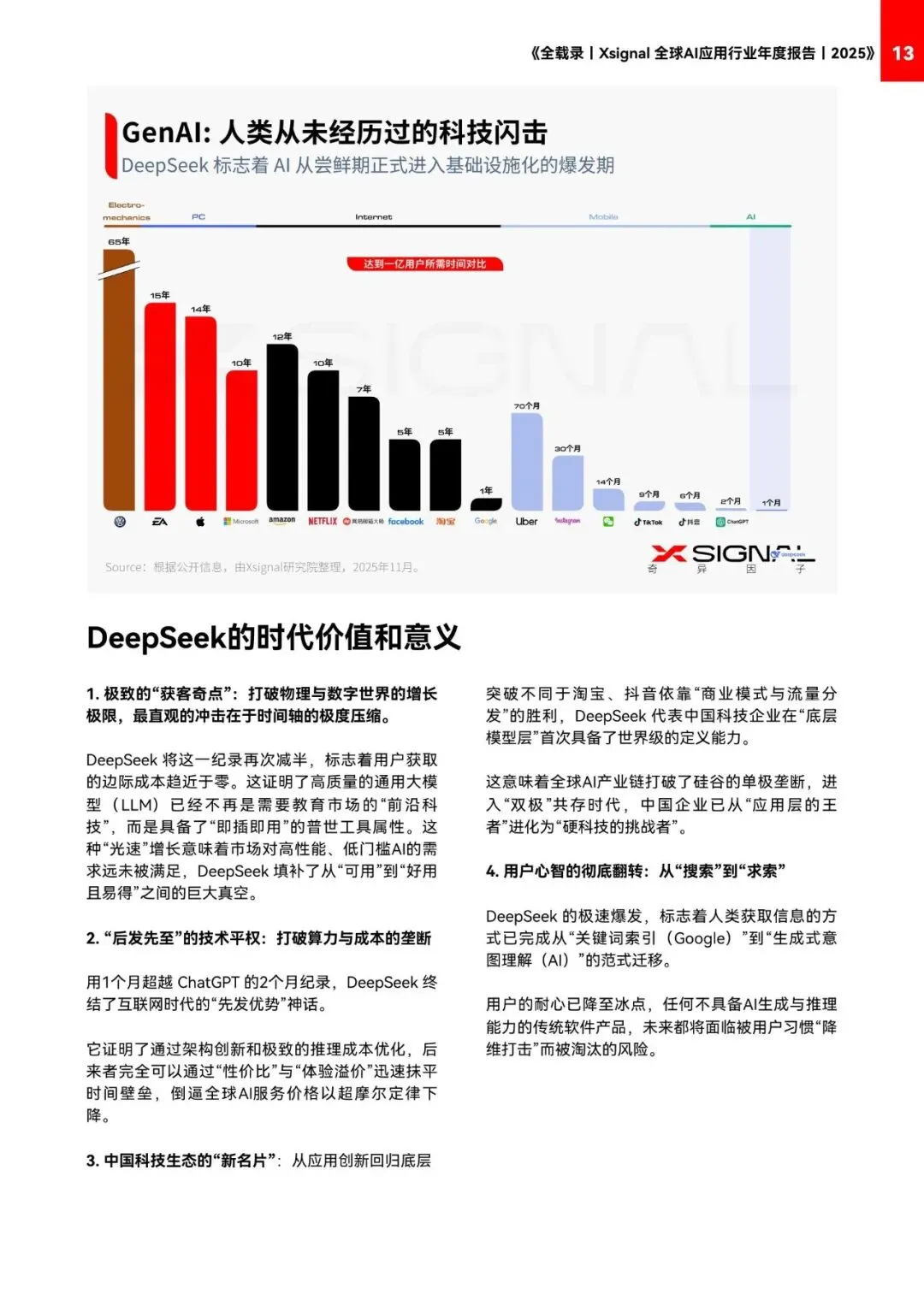 整体而言,2025年是AI应用行业的爆发元年,未来将从“智能生成”向“智能执行”进化,效率提升、视频创作和研发工具等赛道成为增长新引擎。报告呼吁从业者和投资者关注数据背后的用户需求和留存率,以构建真正的行业护城河。