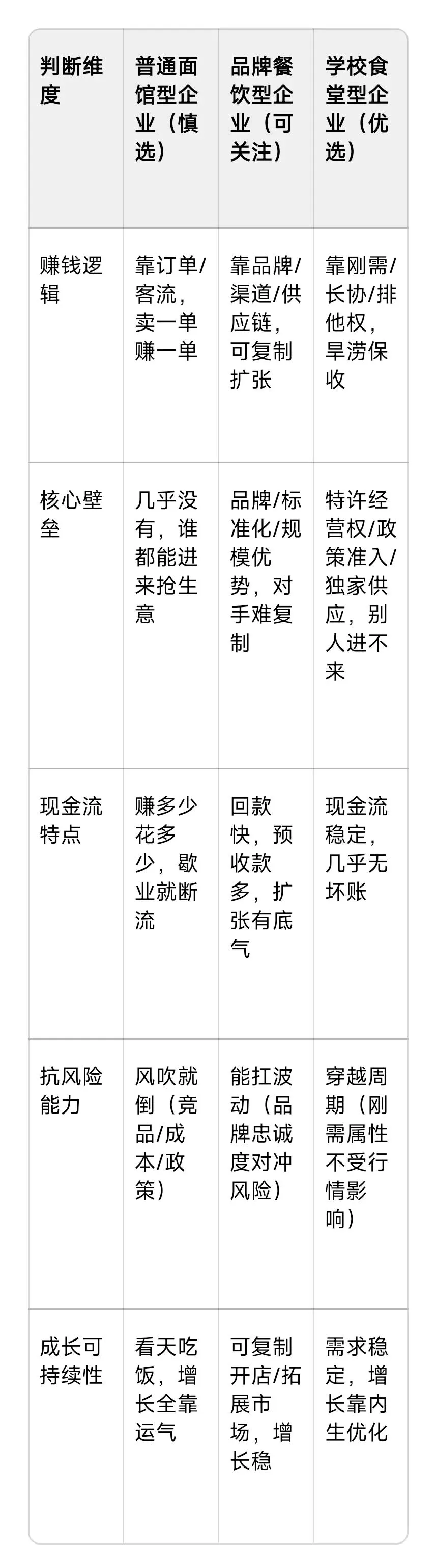 以“面馆/品牌餐饮/食堂”清单逐条对号,快速判断它的投资价值