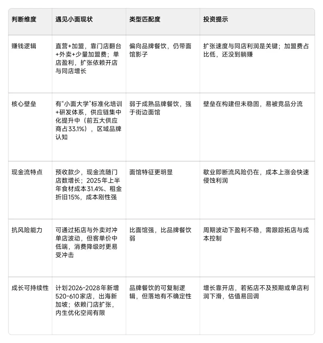 它是努力向品牌餐饮升级的面馆,短期看扩张速度,中期看壁垒是否筑牢,长期看能不能从卖面钱转向“品牌+加盟钱”。