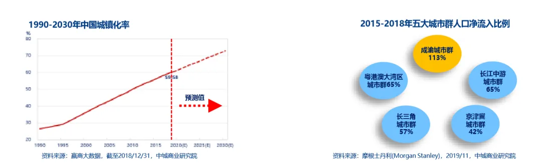 随着城镇化红利的加持,社区商业将成为下一个风口。预计2030年中国城镇化率将突破70%,平均每年新增2000万“市民”,届时将形成2万个以上的新社区。我国五大超级城市群人口规模合计居全球首位,截至2018年已汇聚1.09亿人口,其中以成渝城市群近三年吸引最多人口。