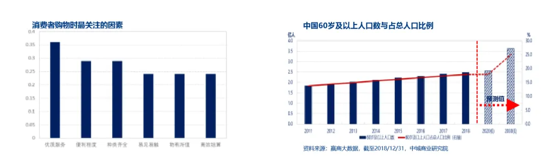 根据《关于促进内贸流通健康发展的若干意见》,住宅用地商业面积不低于10%;此外,商业营业用房开发中,社区商业 开发量占比达55%,显示社区商业供给保持稳定。国内商业地产已由增量进入存量时代,开发商和品牌商转向精耕细作的运营模式,为社区商业的转型升级提供良好条件。便利程度已成消费者优质服务外最关注的因素,消费者对于速度和便利的追求不断提高。此外,“银发经济”助推便利性需求稳步提升。
