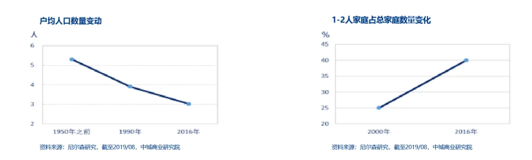 在消费层面,家庭小型化趋势明显,为社区商业的生活类业态带来良好机遇,户均人口下降,1-2人微型家庭数量迅速增加,对零售商影响:家庭日用采购由“按周补货、一次性大额采购”,逐渐转为“按日补货、少量采购”。