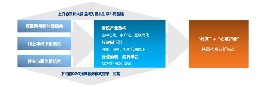首先,生活方式的转变推动社区商业新思维的更新。互联网与物联网的结合,线上与线下的融合,社交与服务的结合等三方面,促使传统产业结构重塑,互联网联通方式下沉,从而促进行业颠覆与跨界融合。即“社区+心塞行业”将重构社区商业新生态。