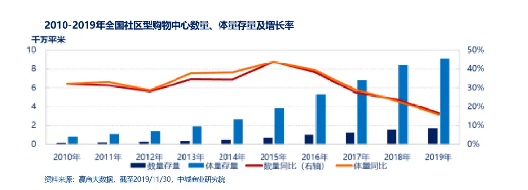 近年来社区商业多为存量改造,是存量增速下滑主因,2015年全国社区型购物中心存量增长率在达到历史高点的43.7%后,自2016年起连续4年增速减缓,2019年截至11月仅达15.6%,主因在于近几年新增的社区商业,多半以存量改造为主,因此并未反应在新增量上。