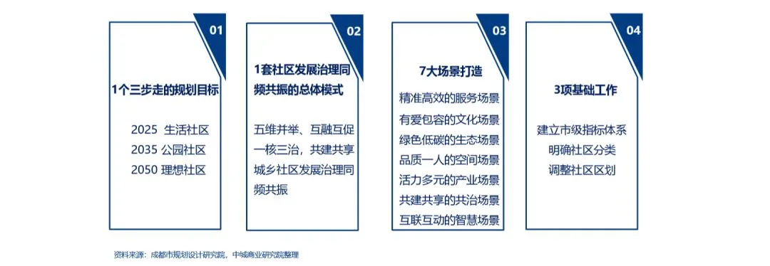 2018年11月成都市政府出台《打造社区商业消费新场景-构建社区优质生活服务圈工作方案(2018-2022)》,将从探索 社区商业转型提质路径设计、分类打造社区商业消费新场景、提升社区商业新场景供给能力等8个方面,进行26项重点工 作。是全国第一个由地方政府主导、专门针对社区商业建设发展推出的具体行动方案。成都政府“1173”为社区商业保驾护航。
