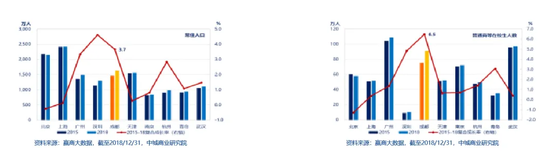 通过城镇社区、产业社区、乡村社区的三重融合,社区规划场景体系逐步健全,成都社区商业将迈入规范化时代。此外,成都人口红利正盛,为发展社区商业提供重要支撑。2018年常住人口数达到1633万人,在全国城市中排名第四(仅次于重庆、上海、北京);户籍人口数 1476万人,净流入人口数157万人(净流入人口=常住人口-户籍人口),是发展社区商业的重要基础。近年来成都经济发展迅猛,搭配政府出台引才措施,2018年成都大学生人数突破80万人,2015-2018年复合增长率高达 6.5%,位居一线、新一线城市之首。年轻学子毕业后若持续留在当地就业,势必对成都的社区商业形成新需求。