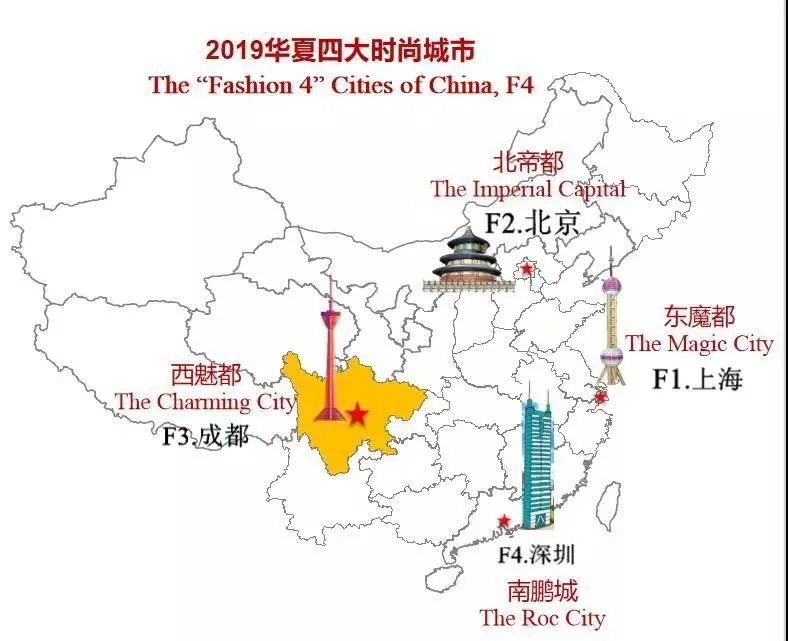 2019年9月中城商业研究院透过三层评选过滤机制,从全国城市中选出12个受评选城市,再根据5大维度、20项指标,构 建华夏时尚指数,对12个城市进行评分,最终由上海、北京、成都、深圳脱颖而出,成为2019年华夏四大时尚城市。其中,成都的时尚支撑度和时尚敏感度表现不俗,显示成都居民生活水平、消费实力,以及商业创新力、品牌吸引力皆较 为出众,因而享有“魅都”之美名。